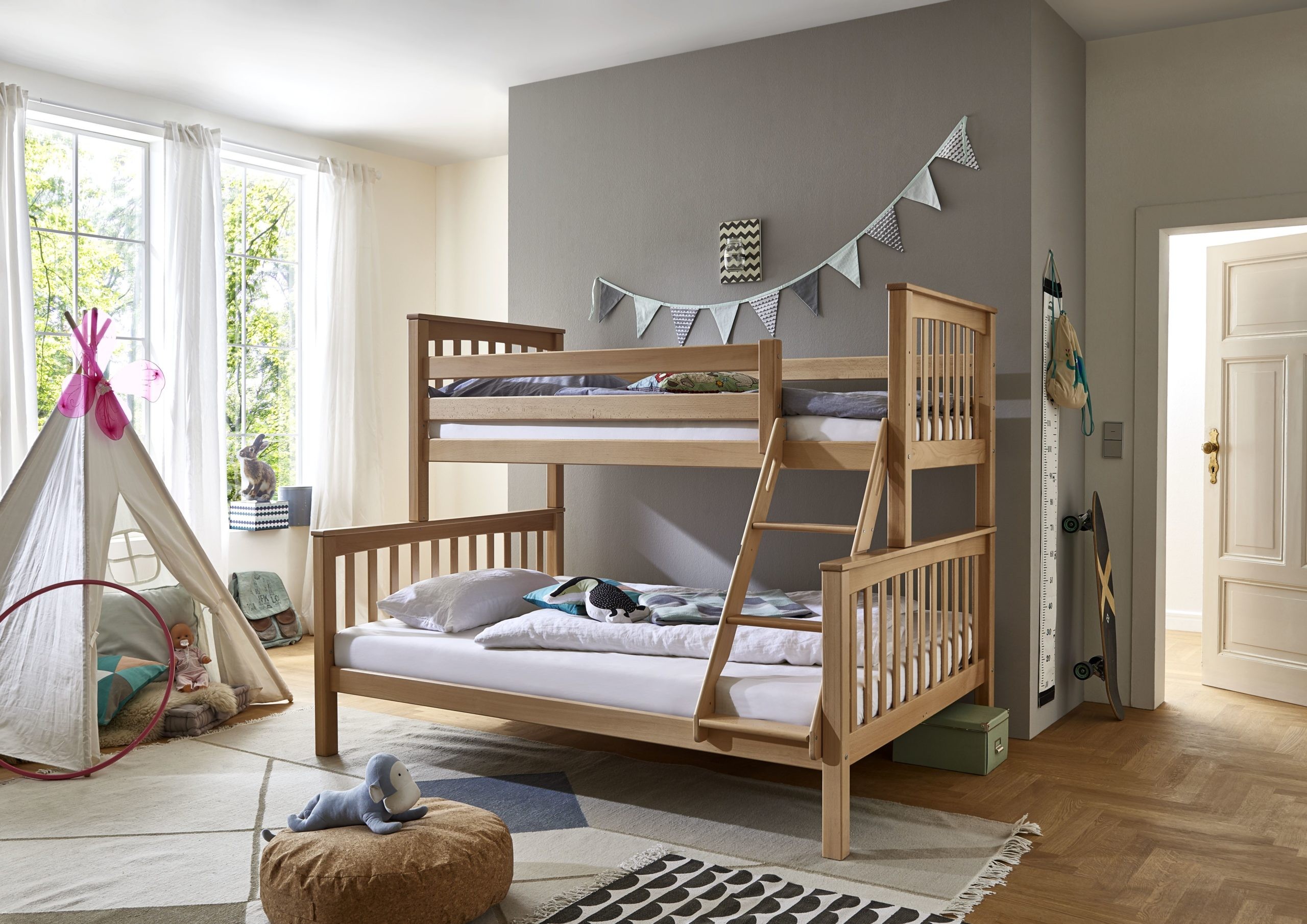 Etagenbett Kick Buche massiv natur lackiert mit Textilset best. aus Vorhang und Tasche