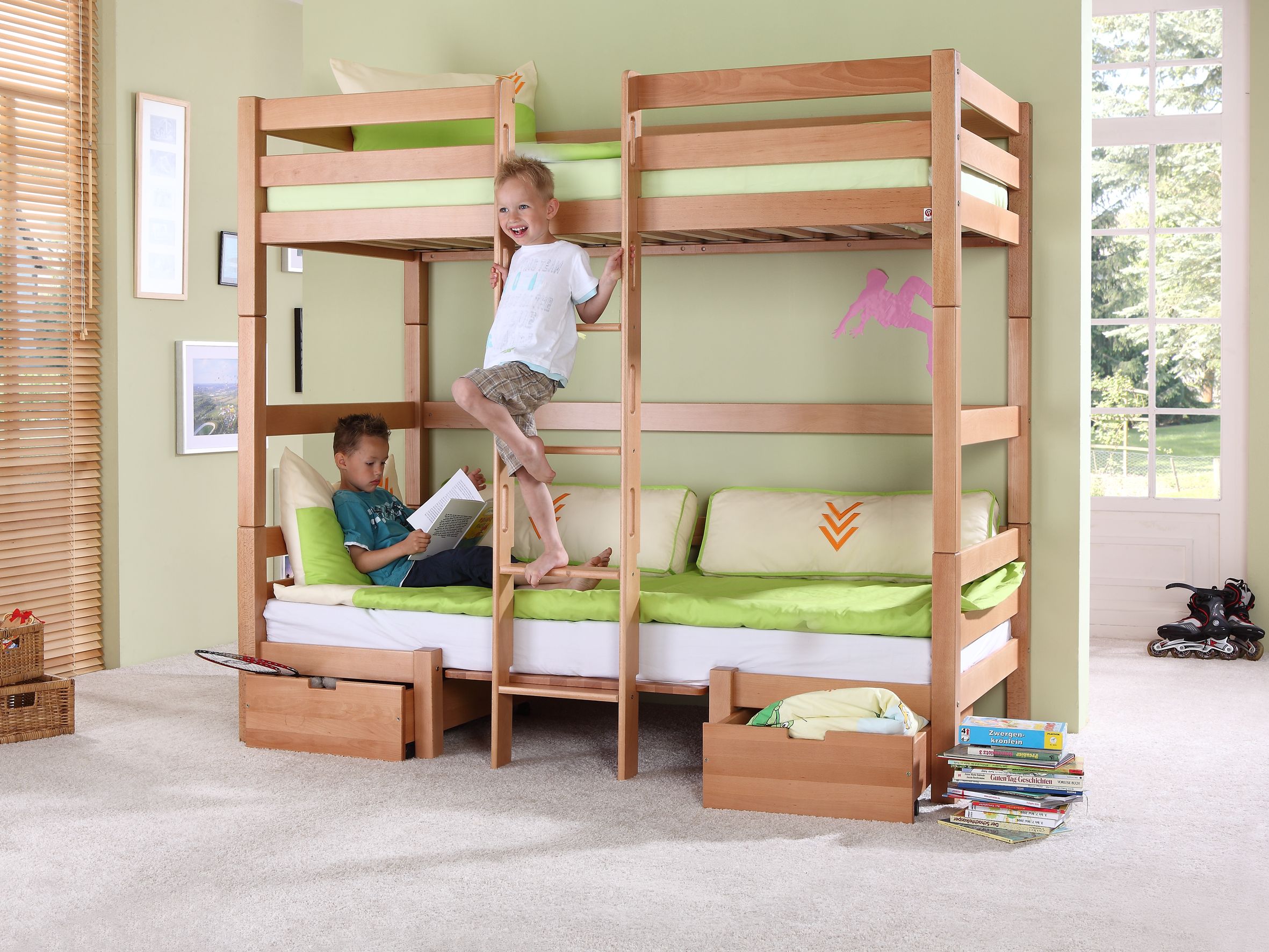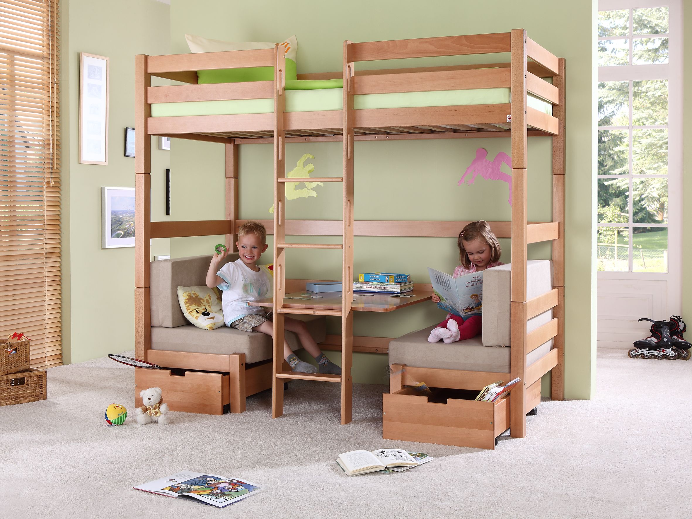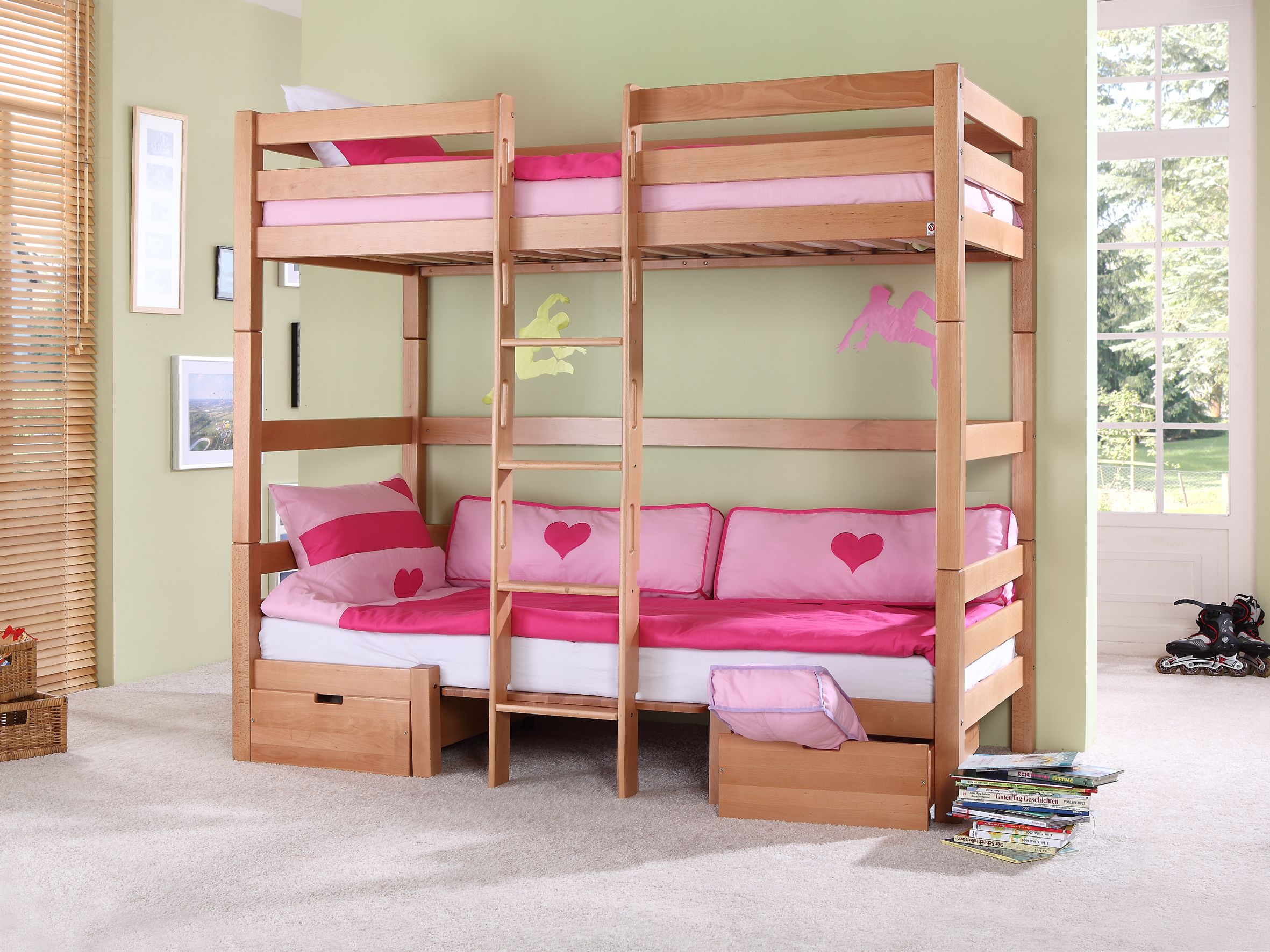 Etagenbett FINLEY Buche massiv natur lackiert mit Sitzgelegenheit und Kissen