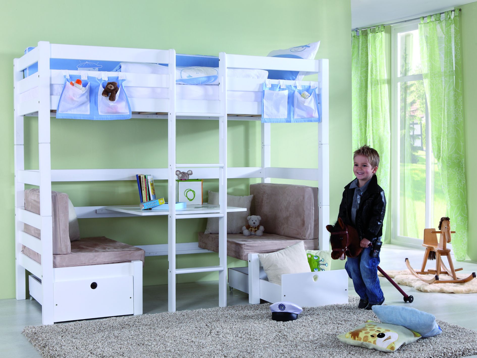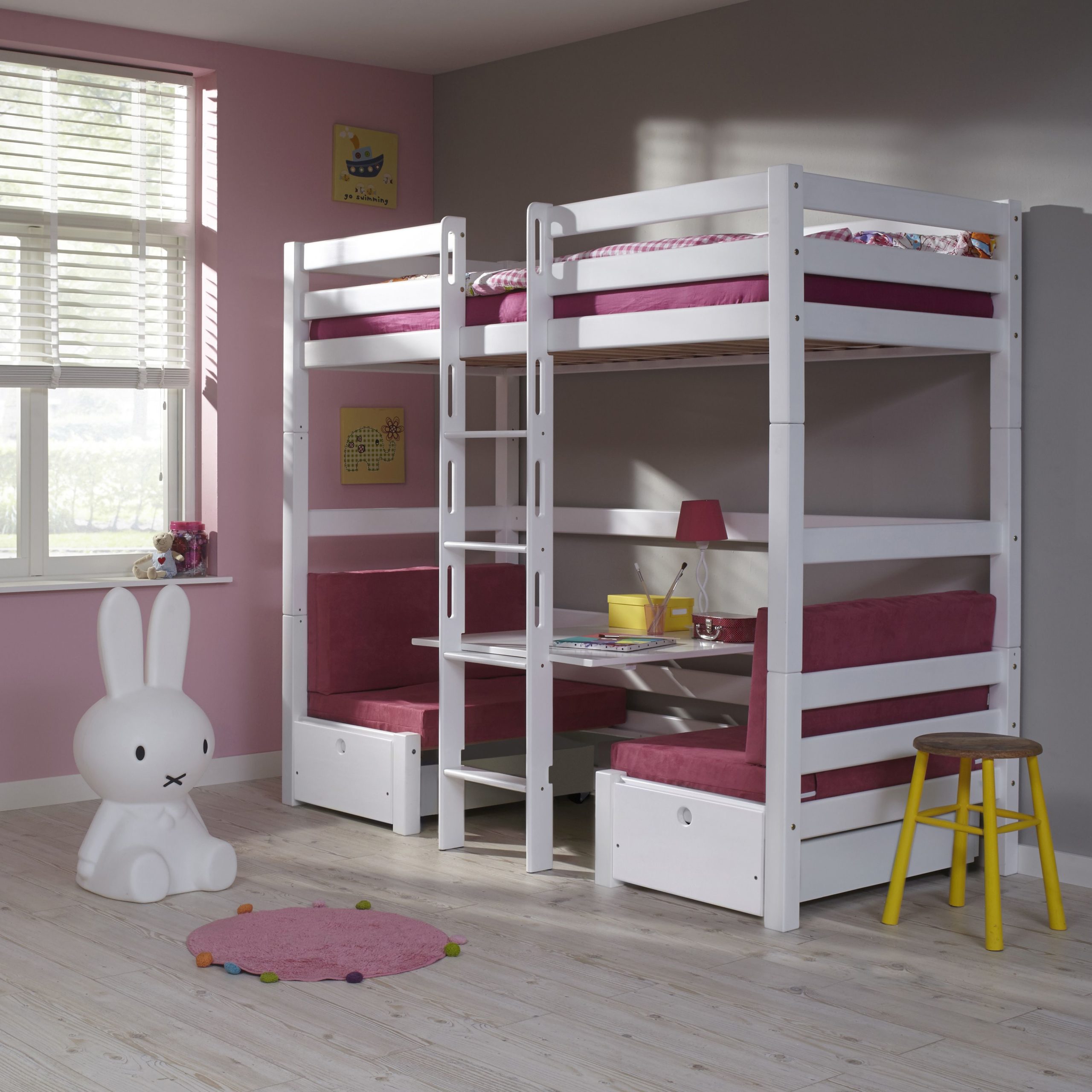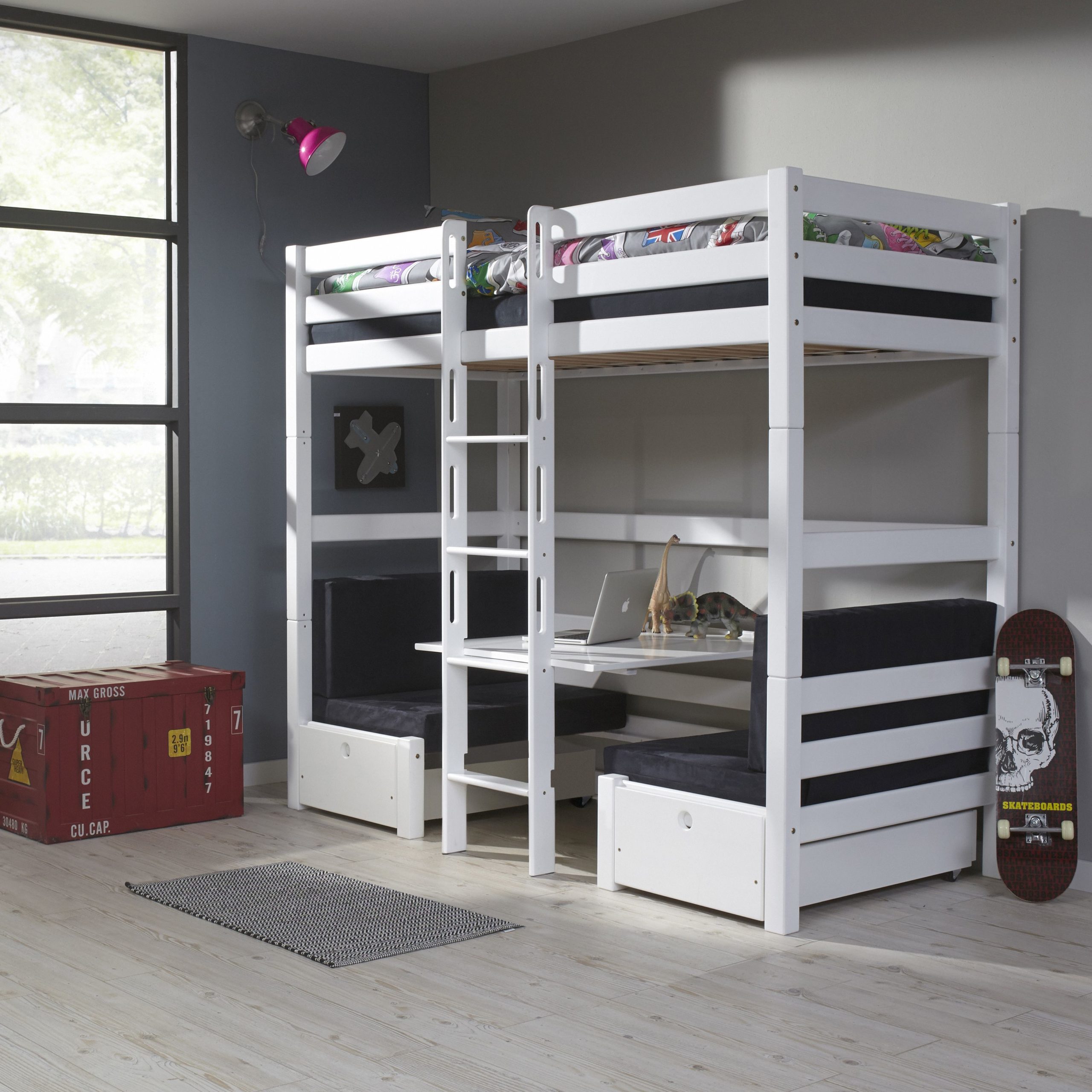 Etagenbett FINLEY Buche massiv weiß lackiert mit Sitzgelegenheit und Kissen