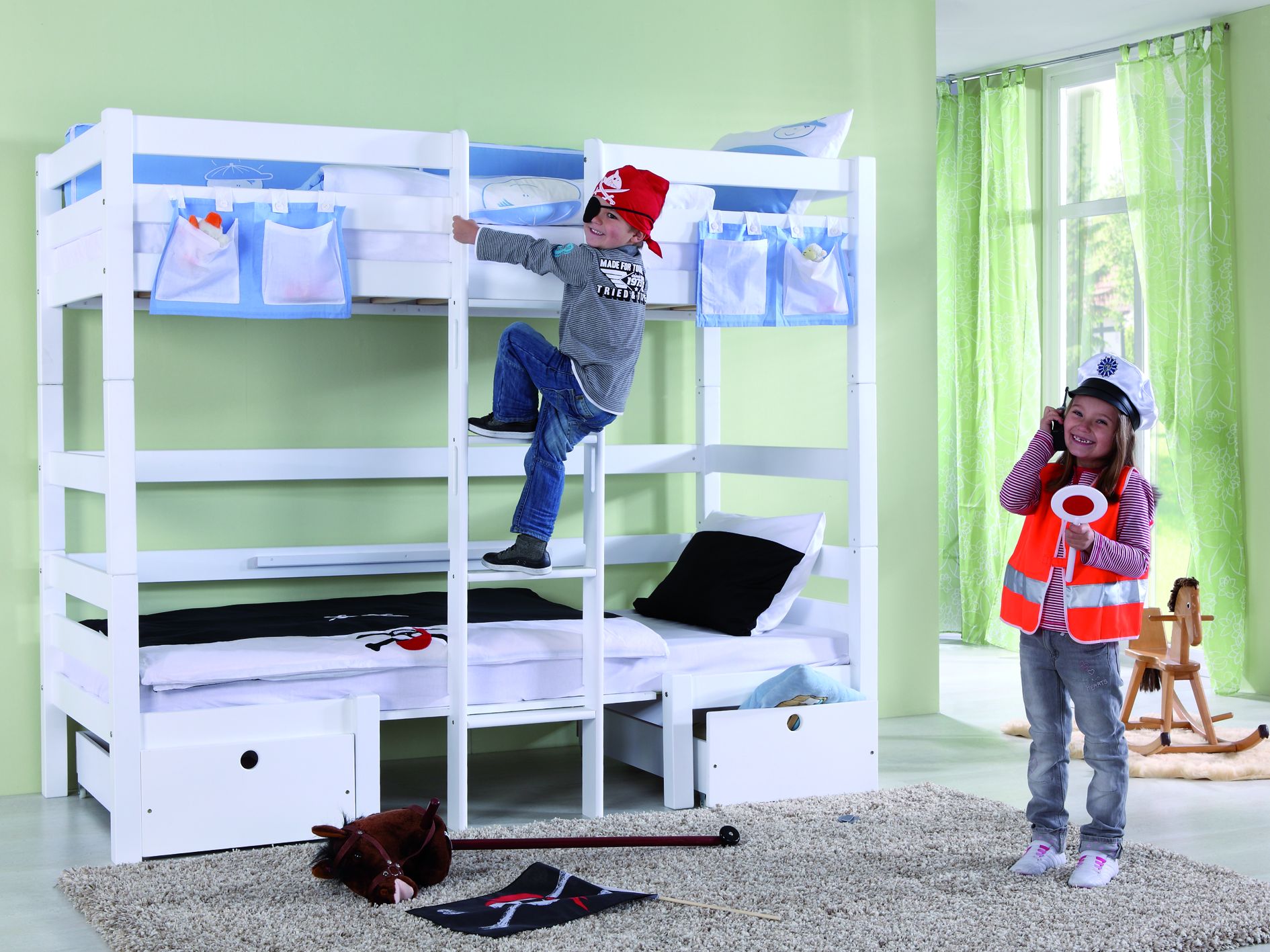 Etagenbett STEFAN Buche massiv weiß lackiert mit Stoffset