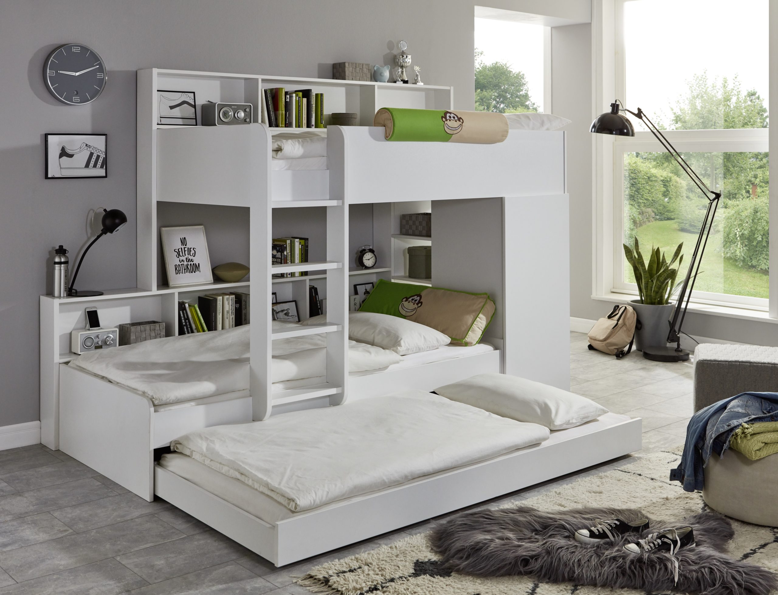 Etagenbett FINLEY Buche massiv weiß lackiert mit Sitzgelegenheit und Kissen