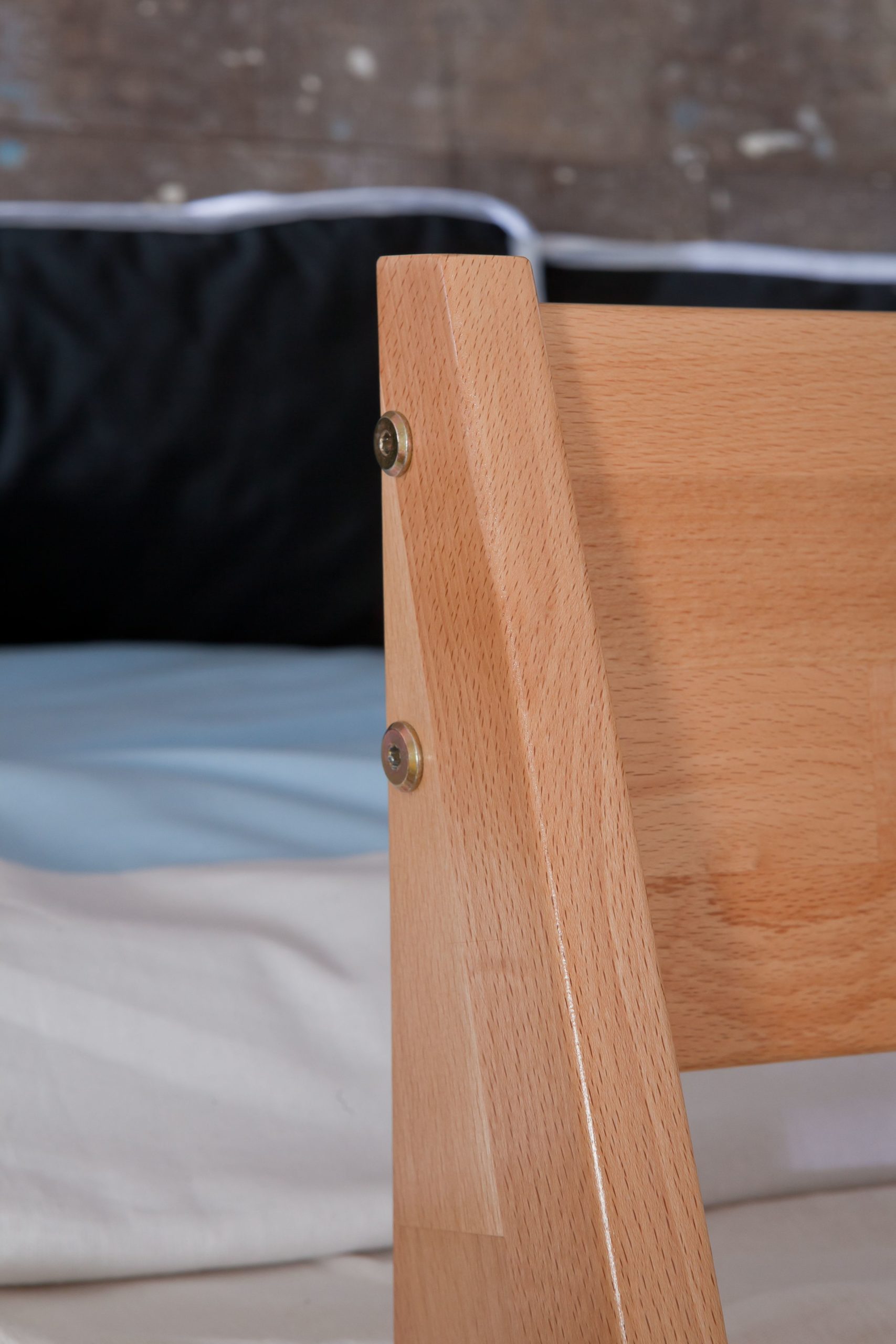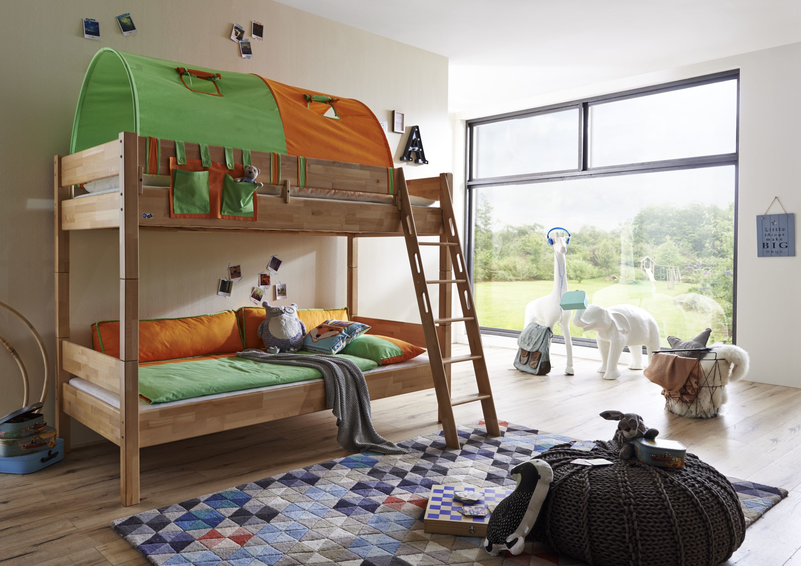 Etagenbett FINLEY Buche massiv natur lackiert mit Sitzgelegenheit und Kissen
