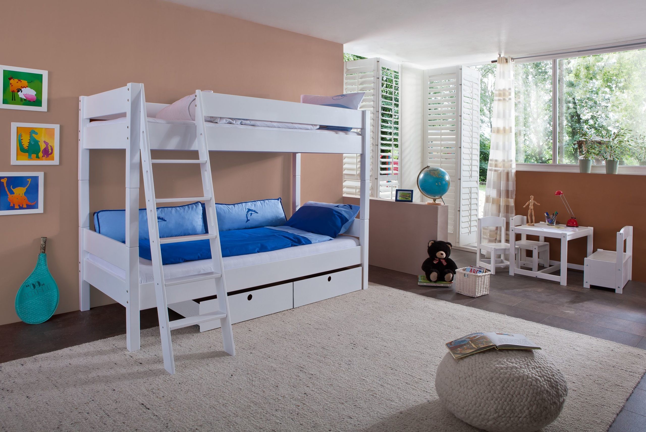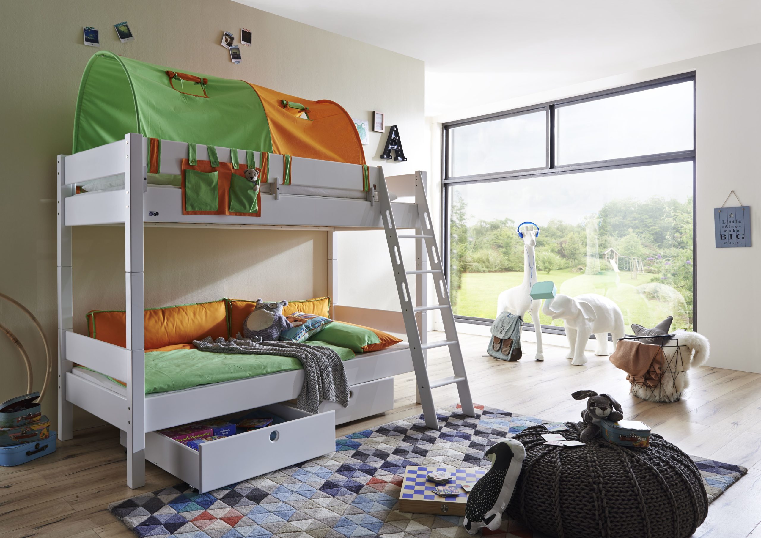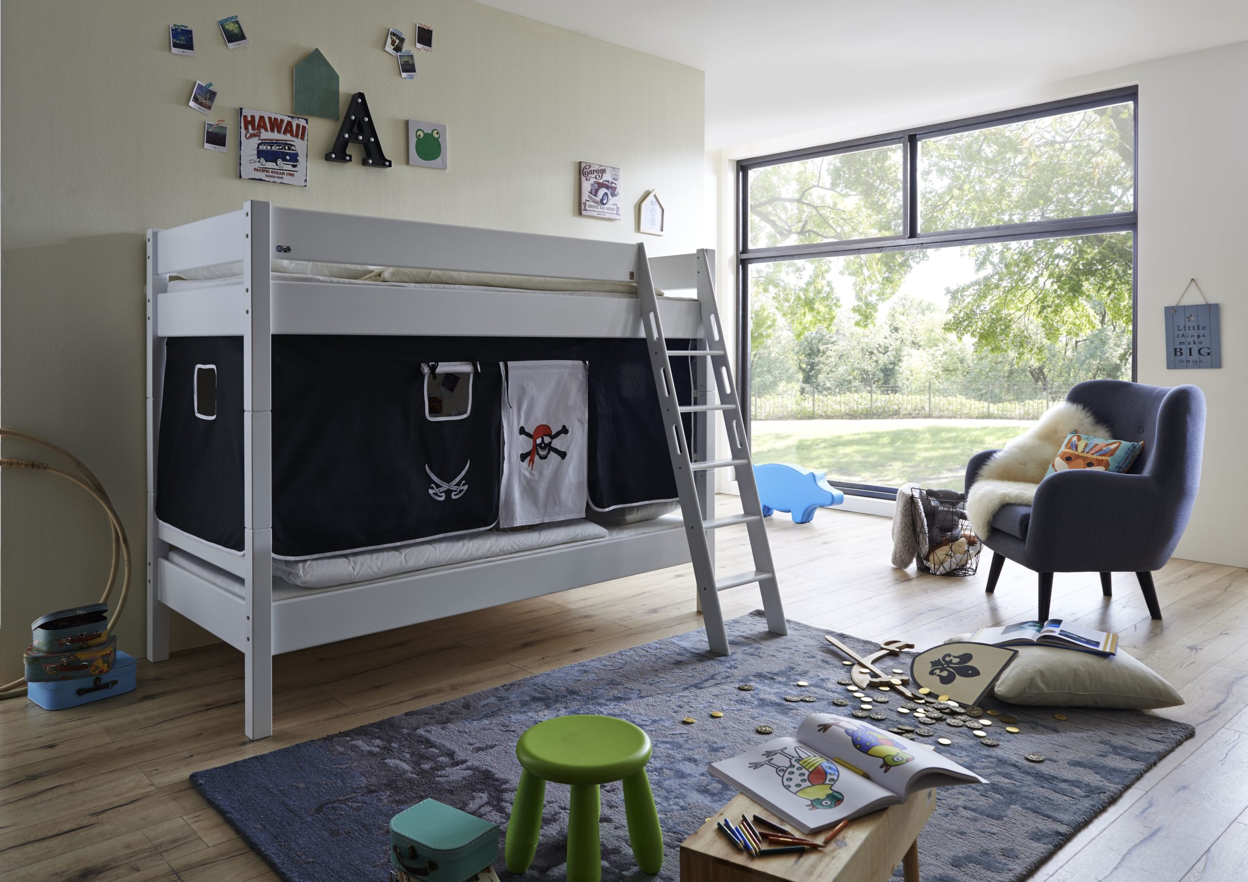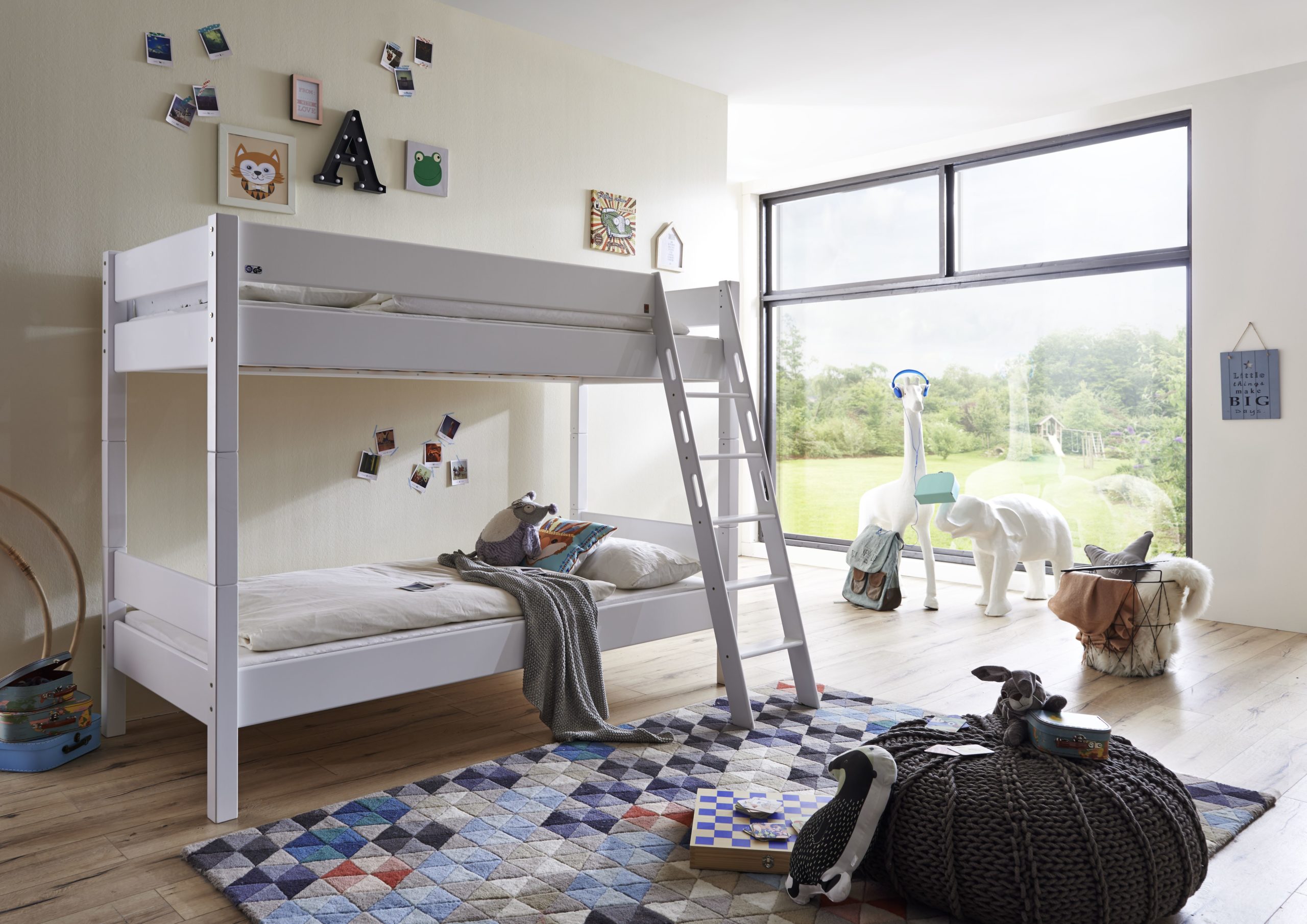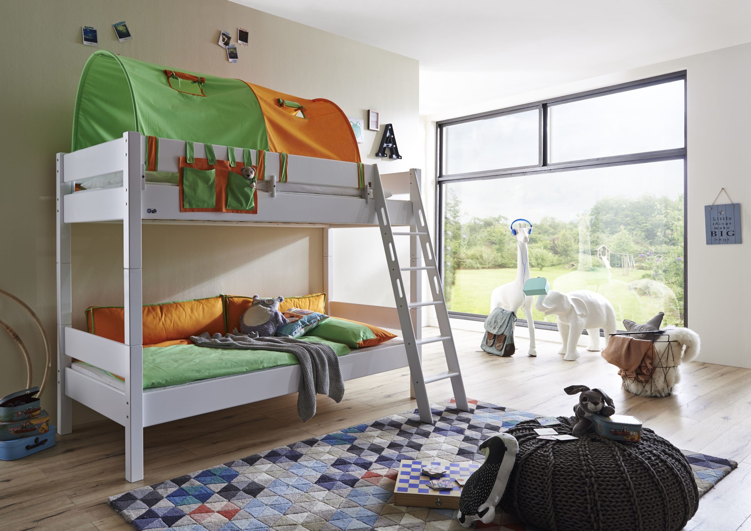 Etagenbett STEFAN Buche massiv weiß lackiert mit Stoffset