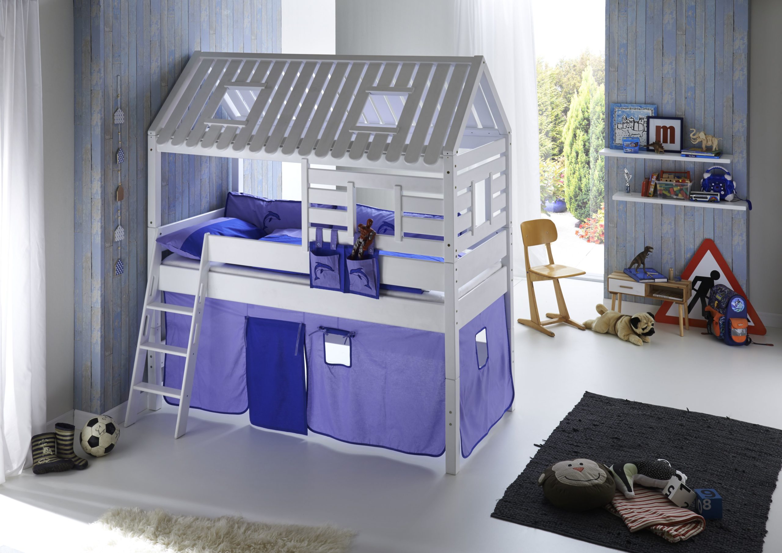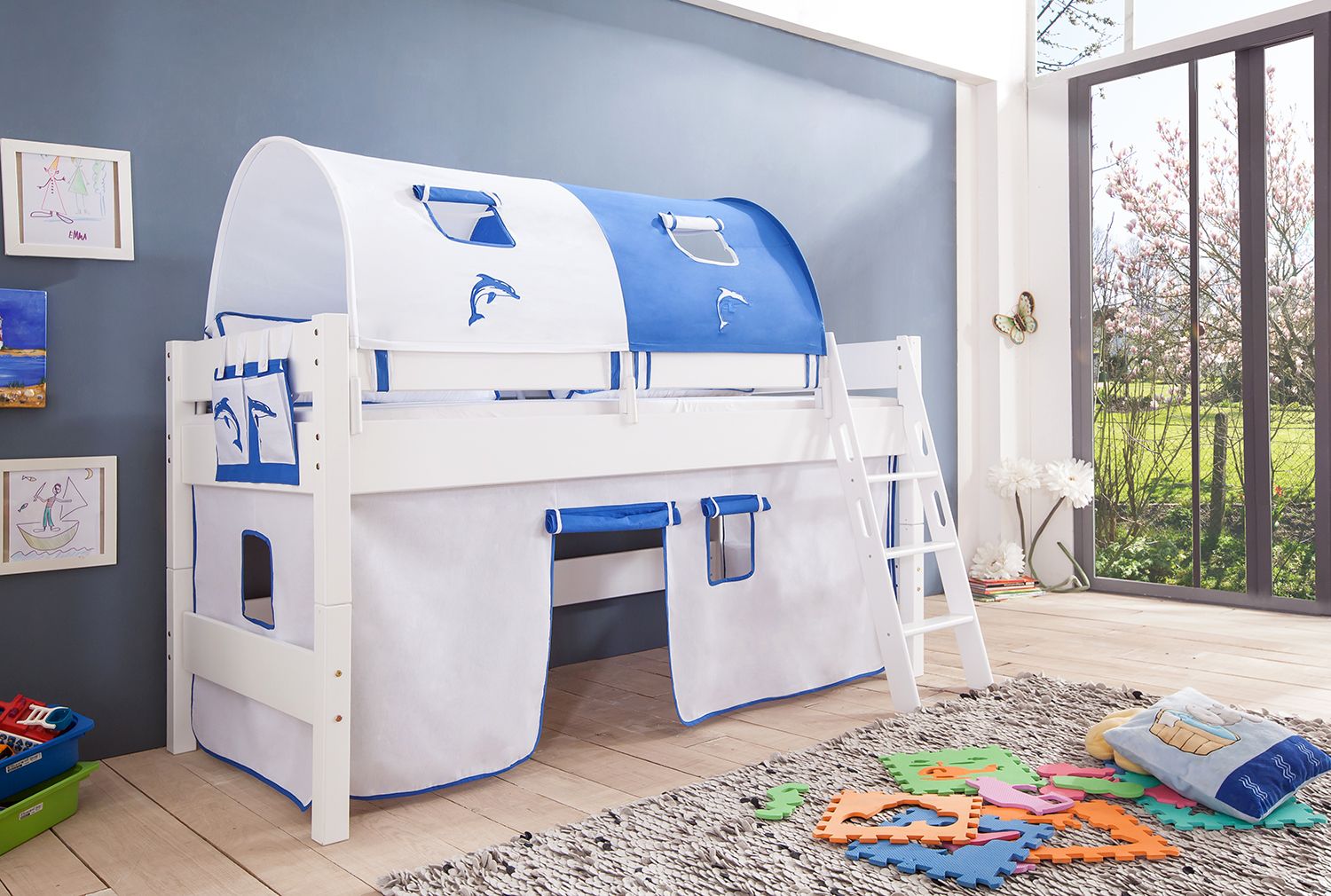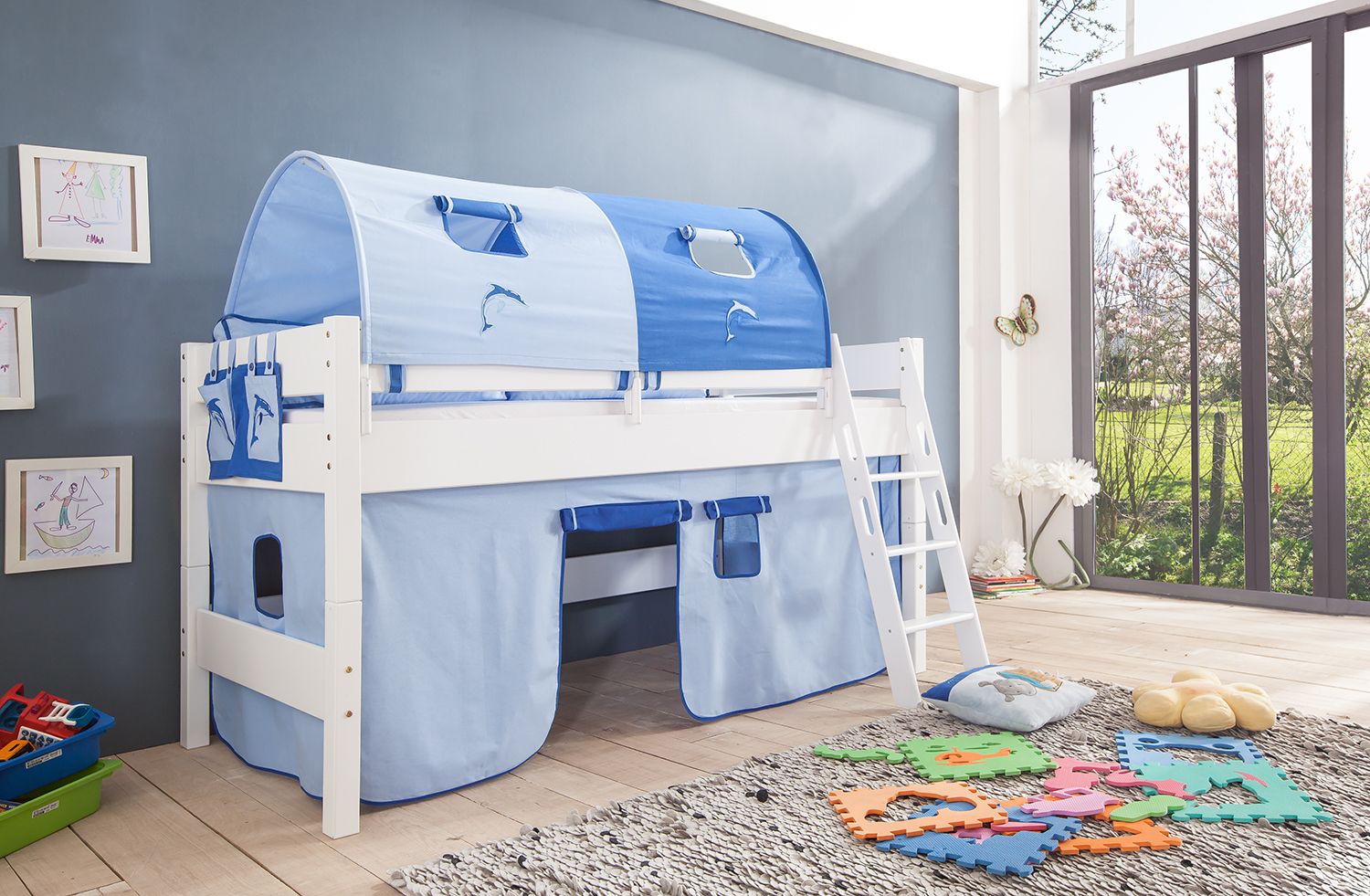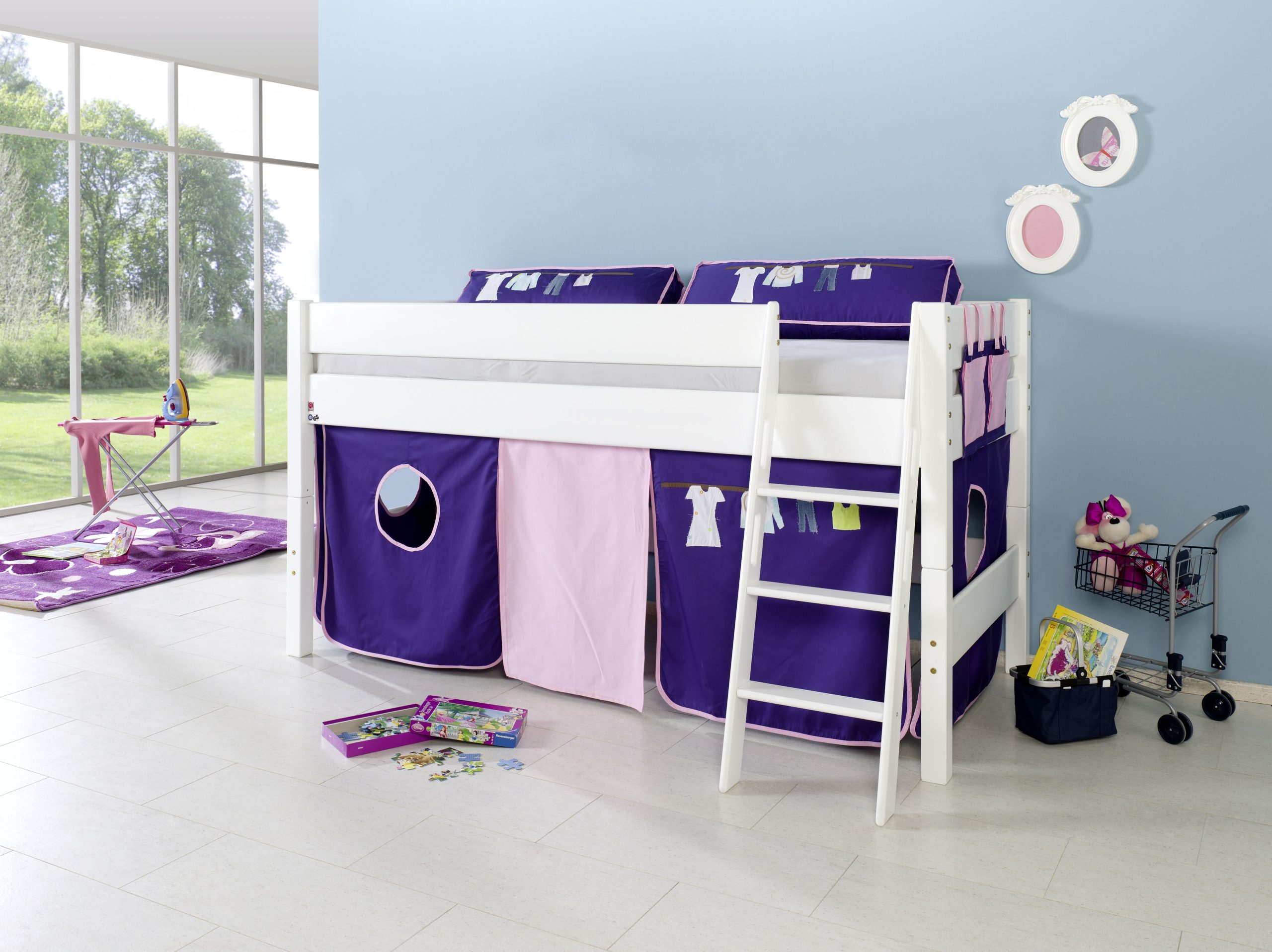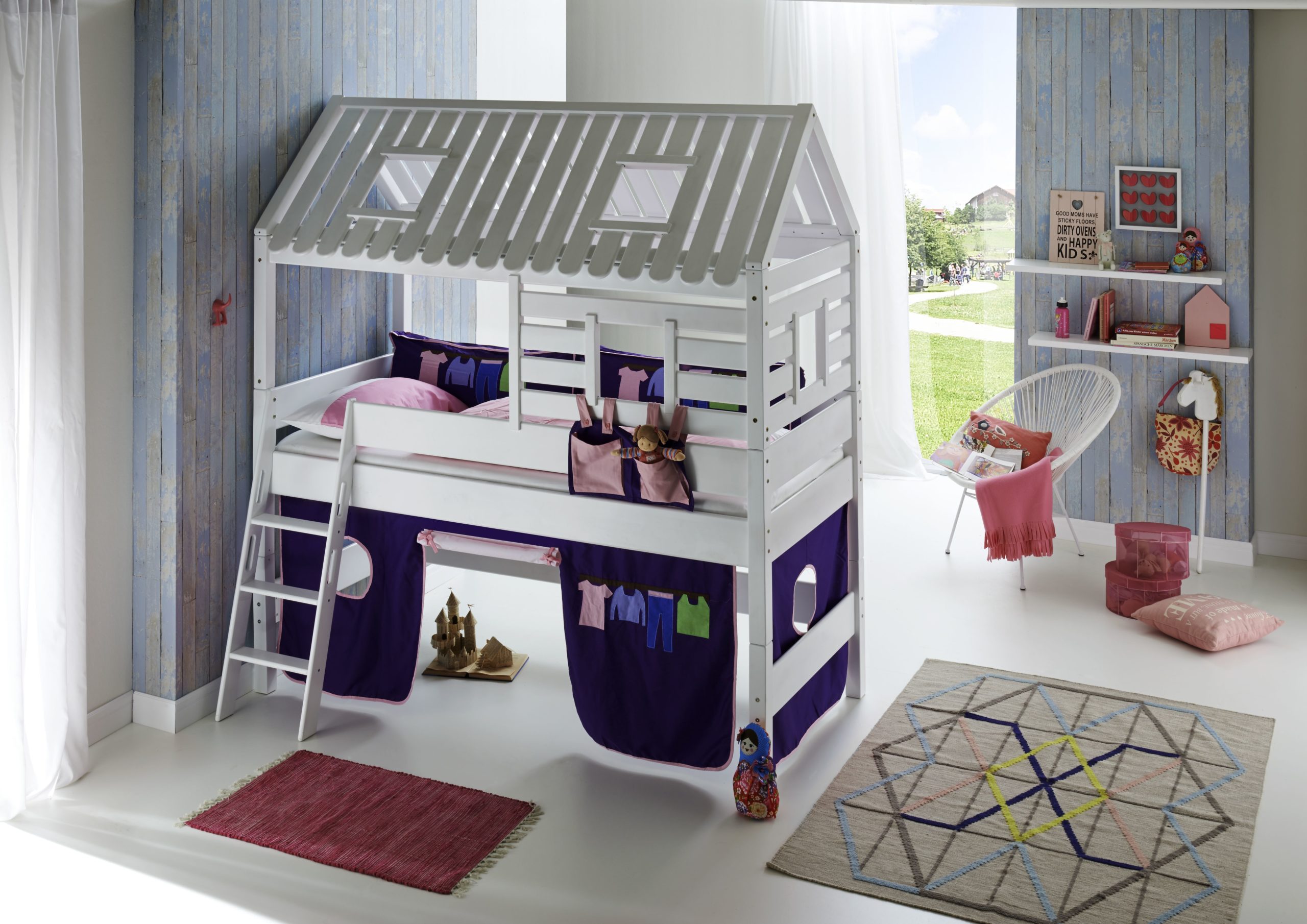 Hochbett KIM Buche massiv weiß lackiert mit Textil-Set