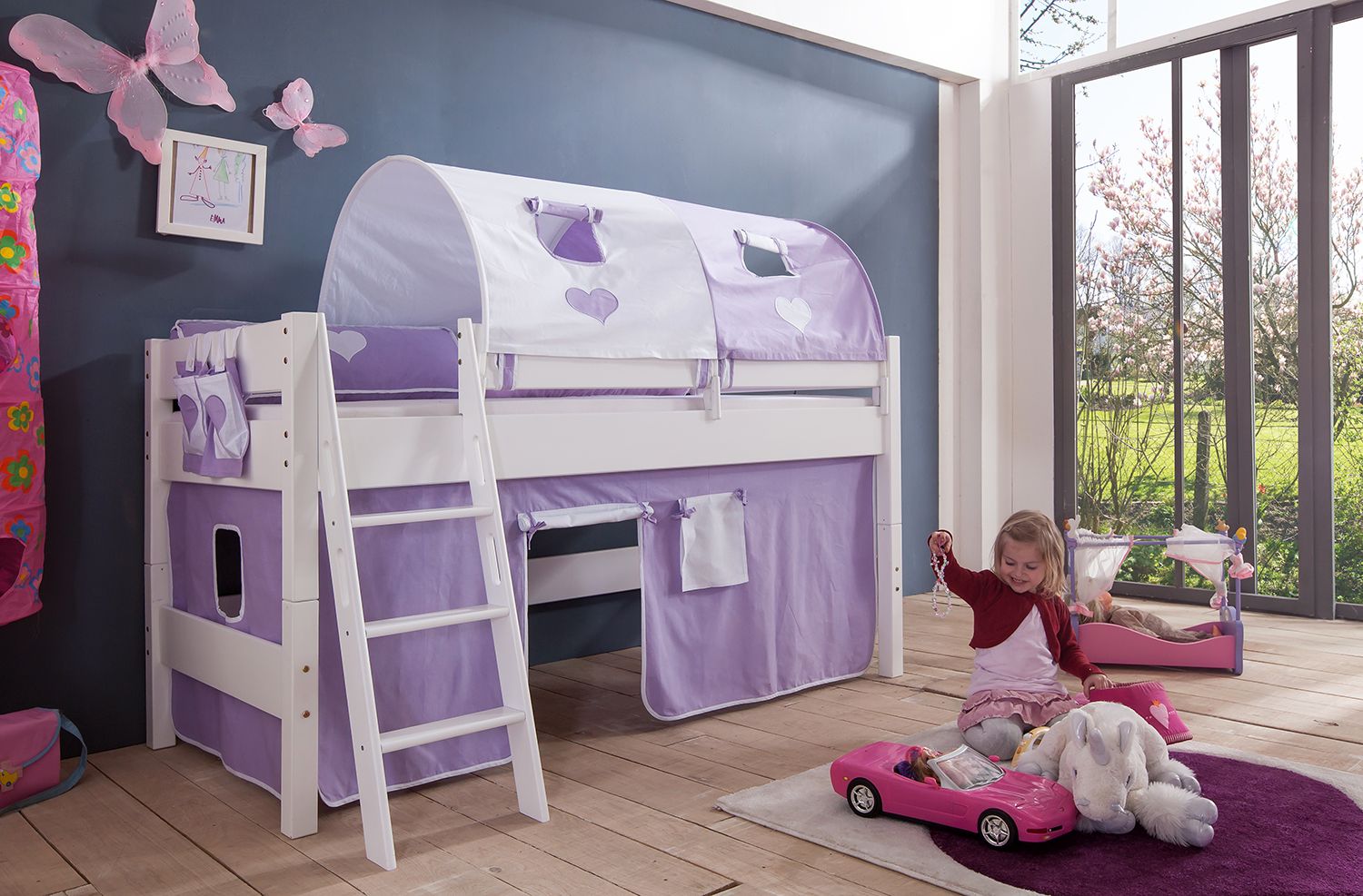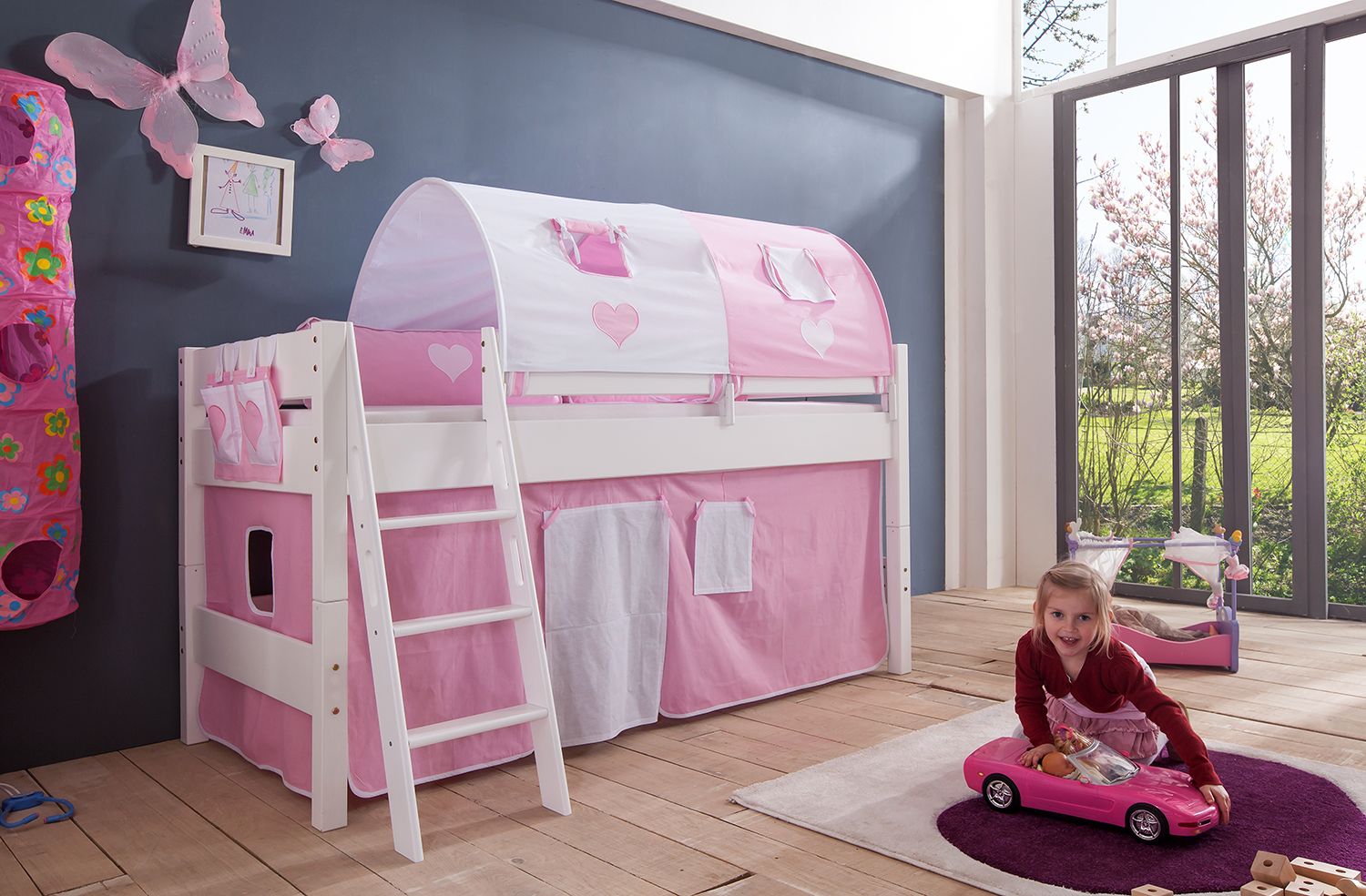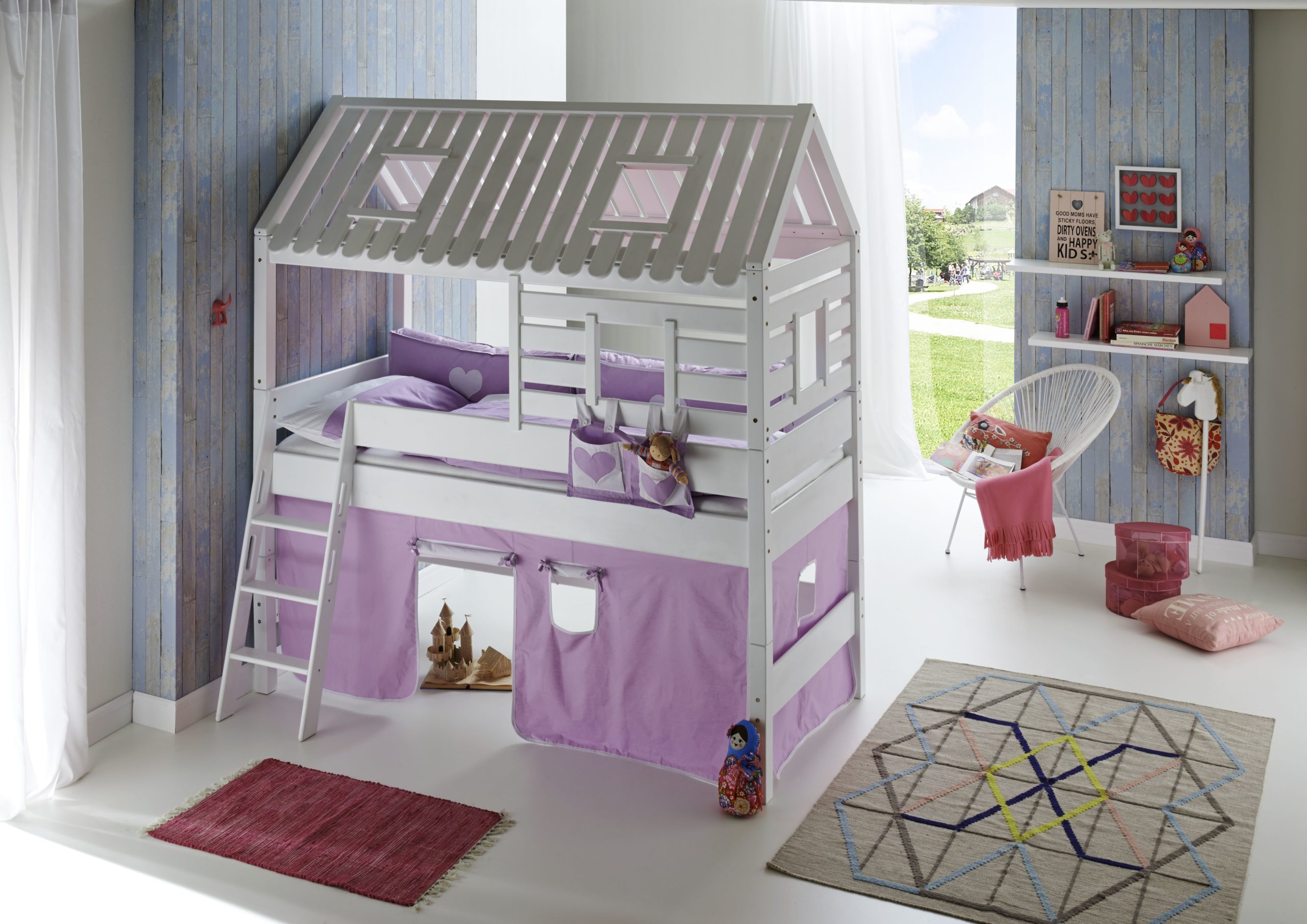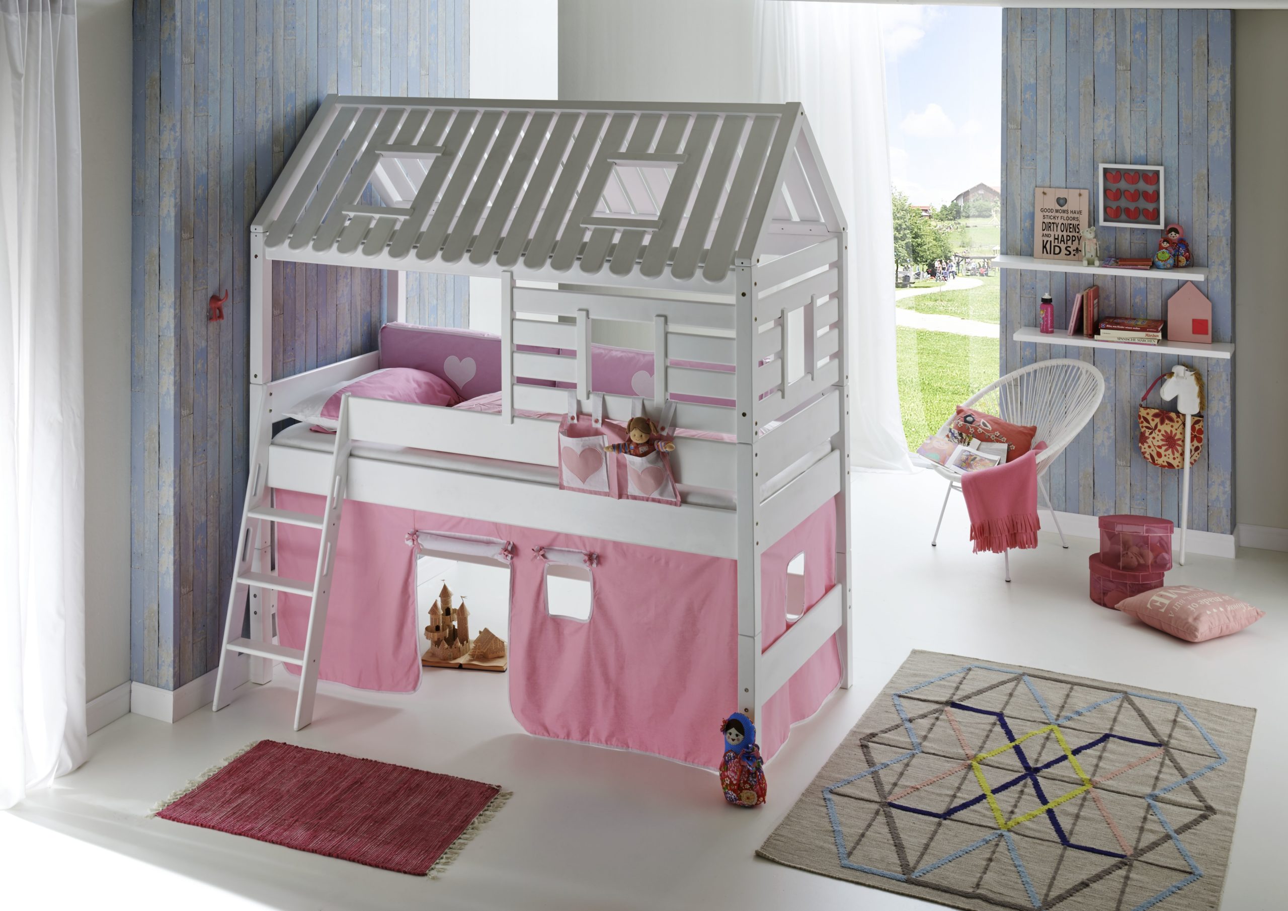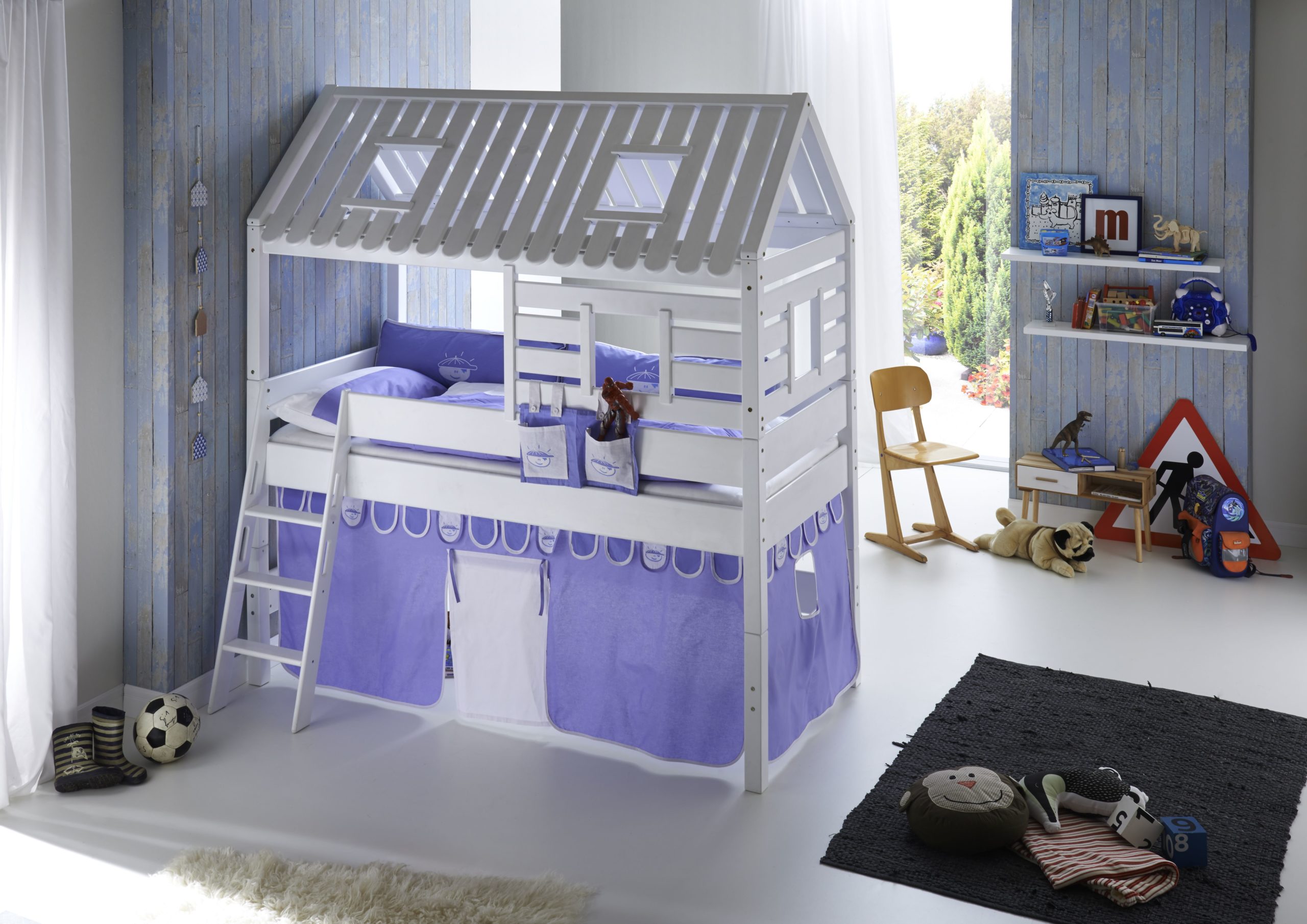 Hochbett KIM Buche massiv weiß lackiert mit Textil-Set