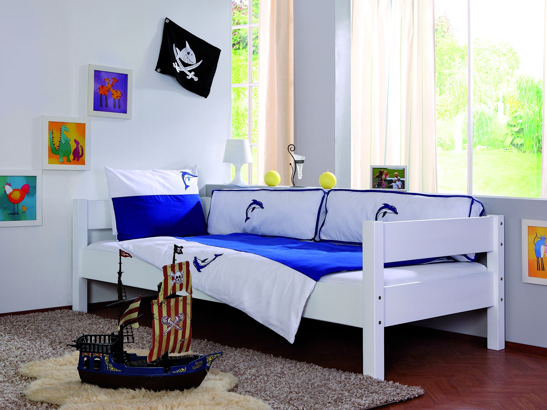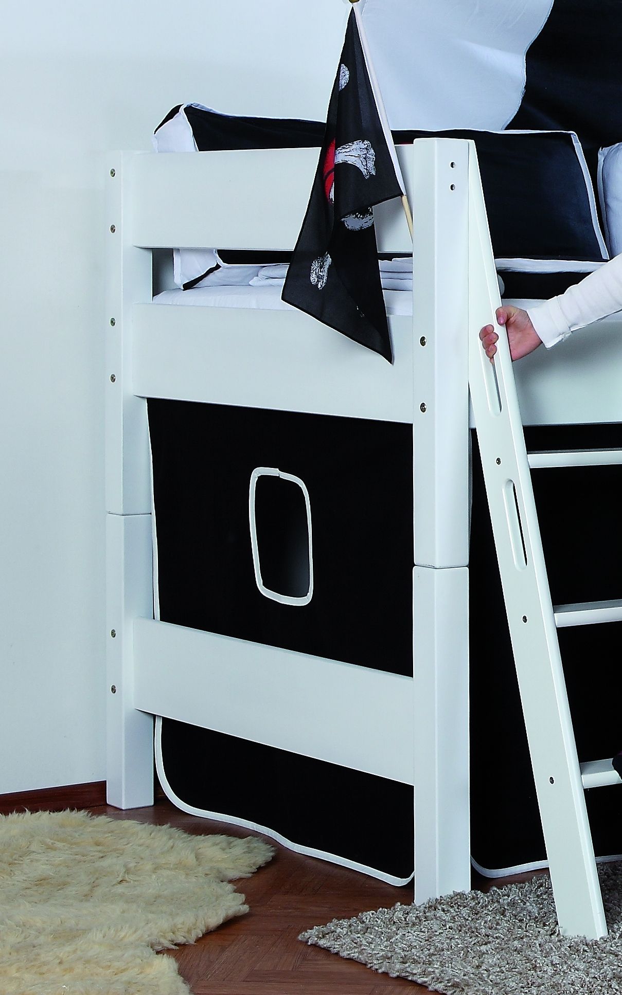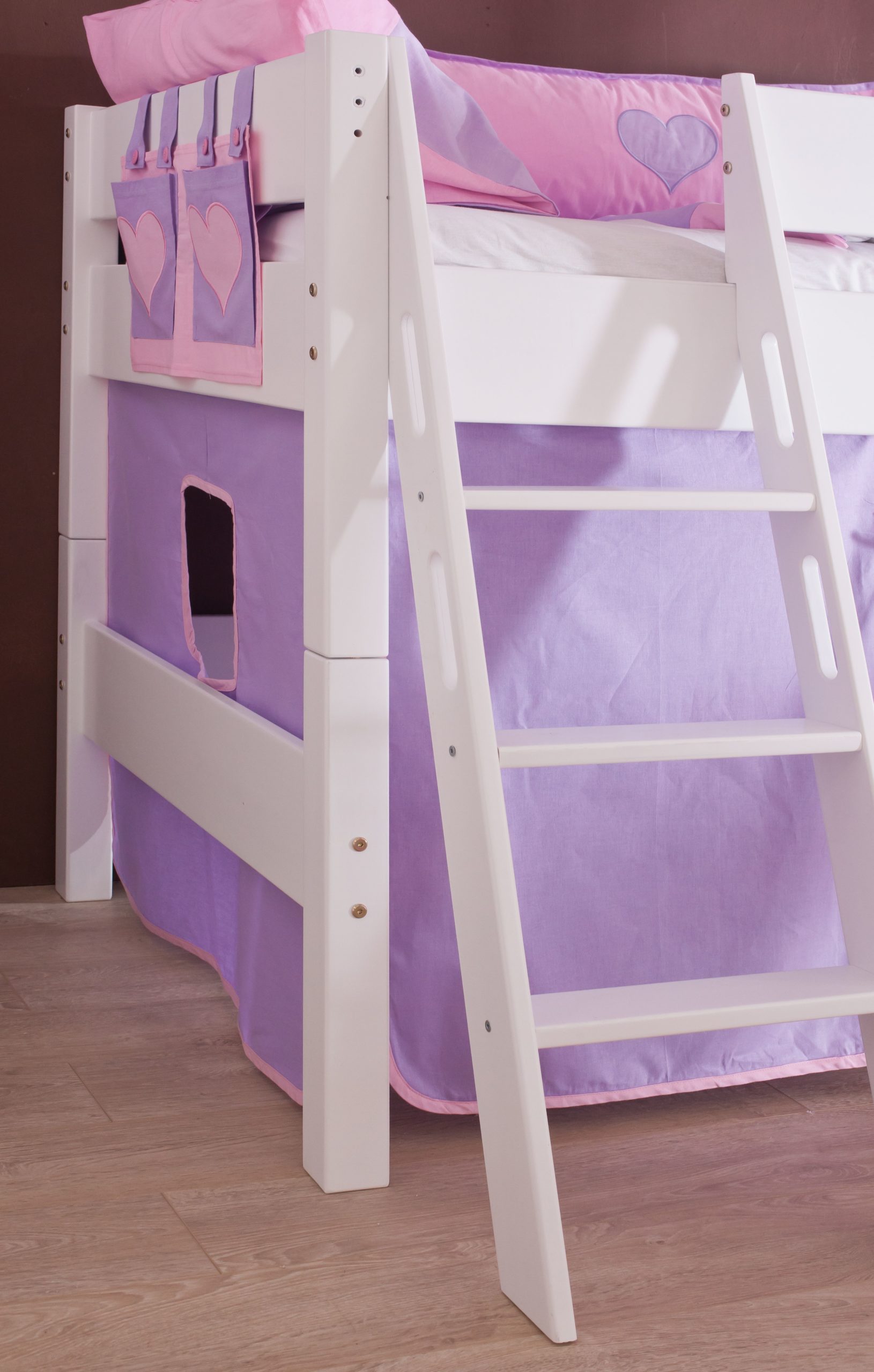 Halbhohes Spielbett SAM Buche in Bi-Color lackiert mit Vorhang