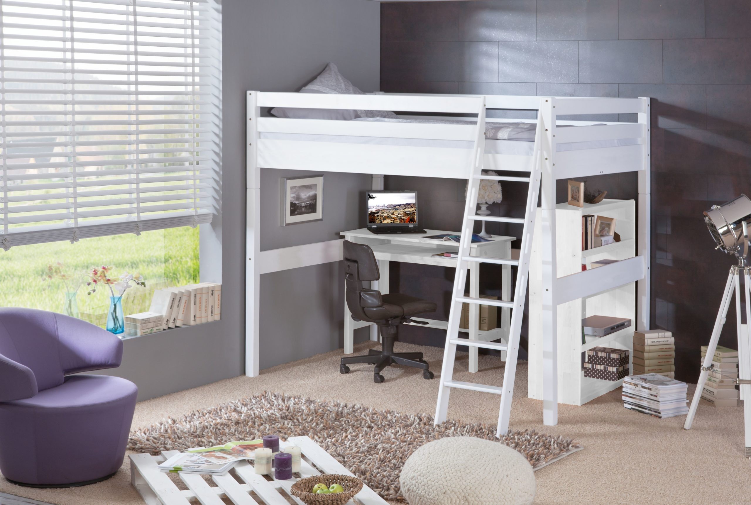 Hochbett RENATE Buche massiv weiß lackiert mit Schreibtisch