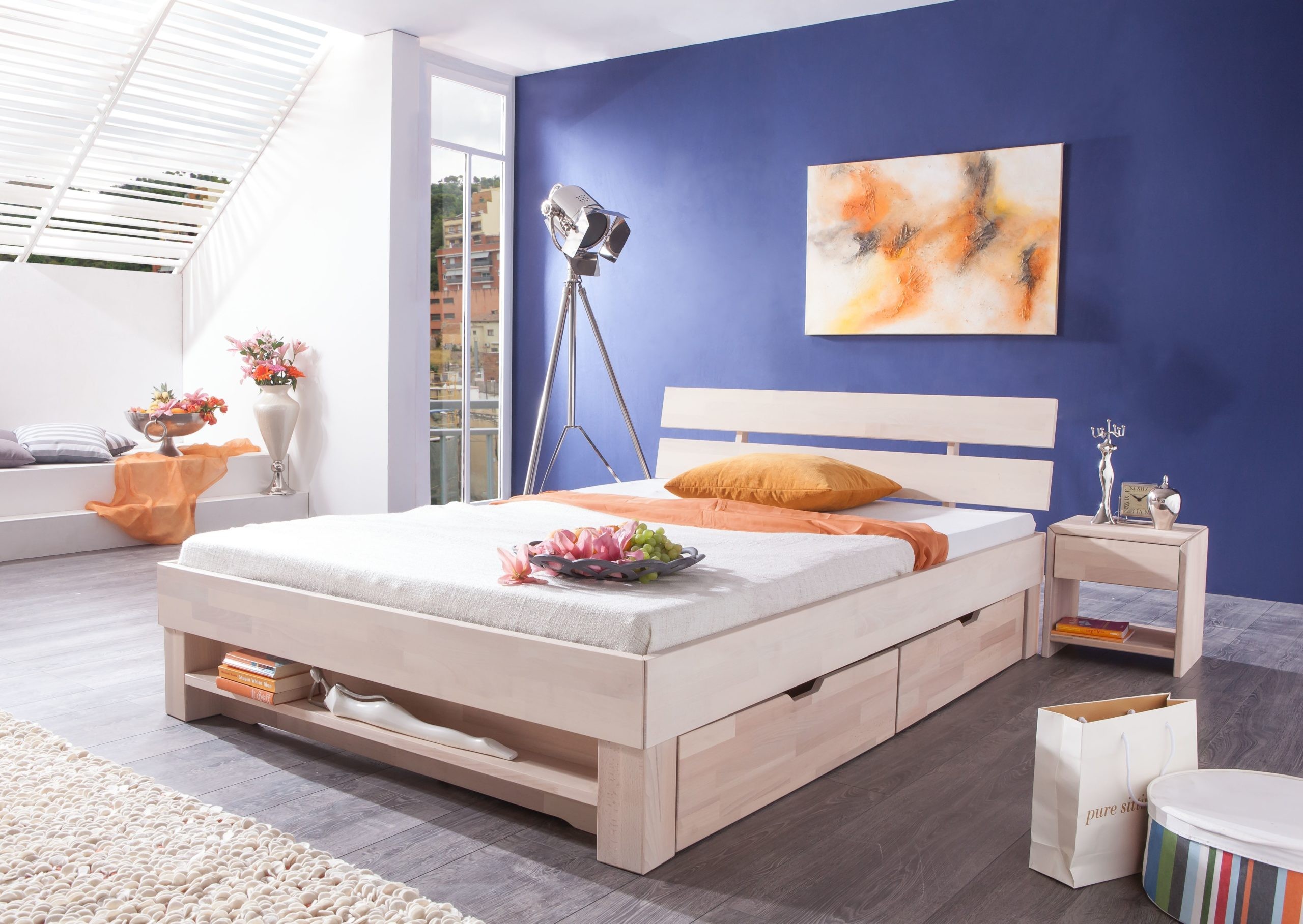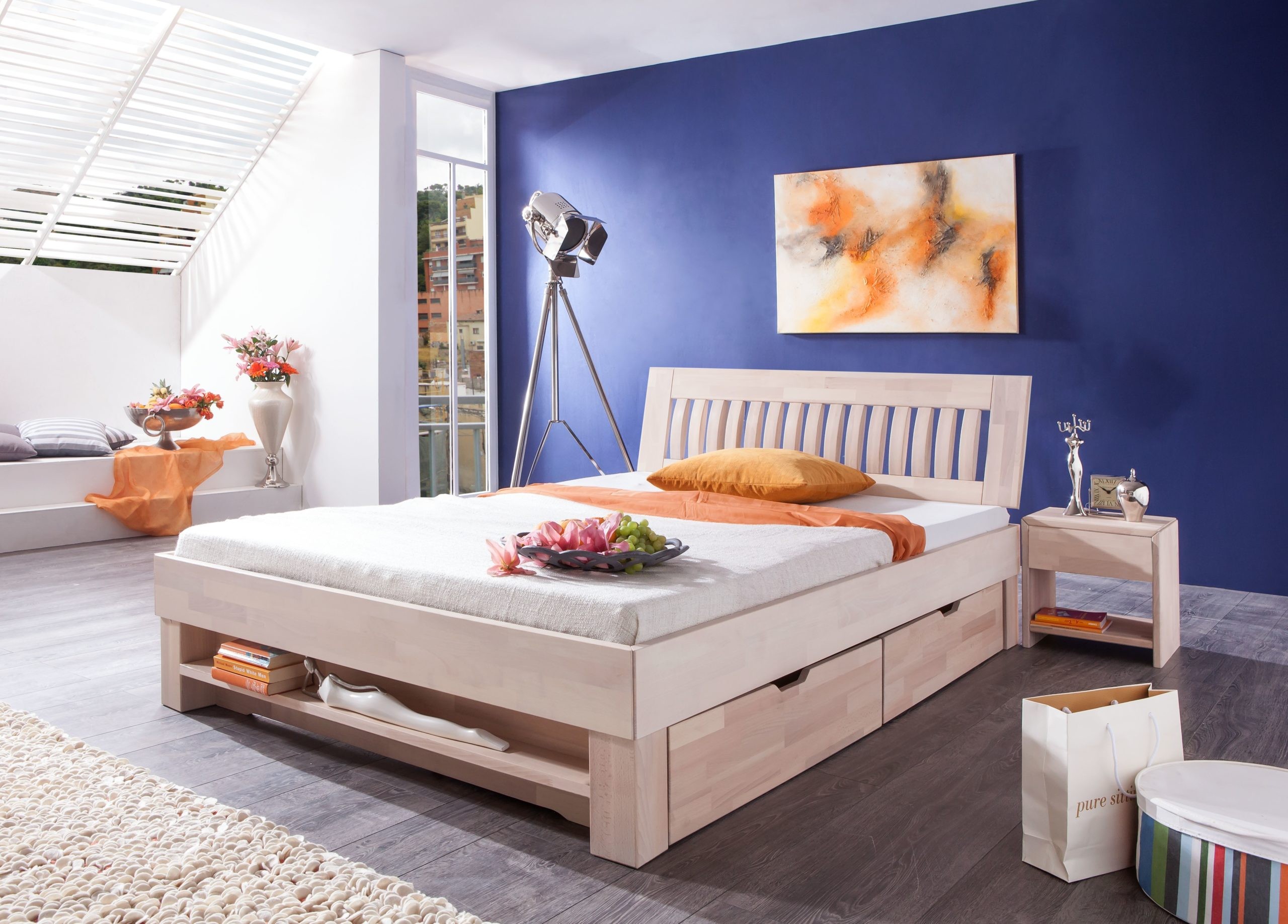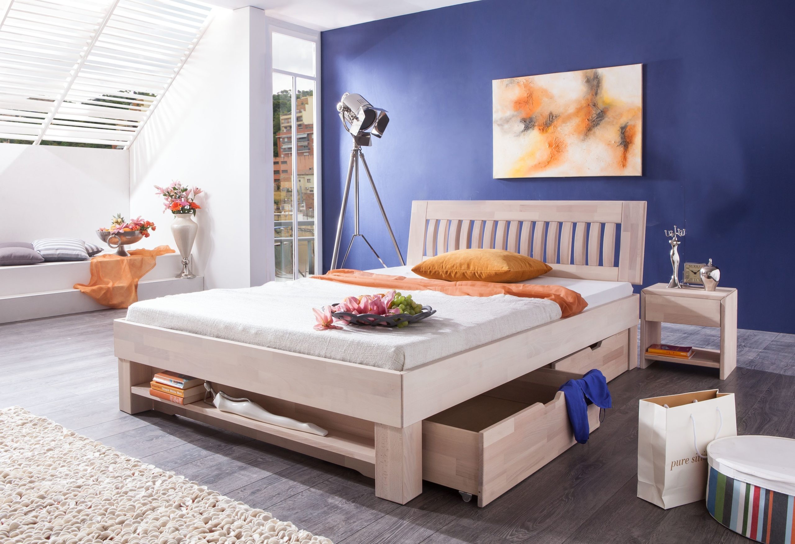 Halbhohes Bett Kick 90 x 200 mit Lattenrost Textilset und Rutsche Buche massiv natur lackiert