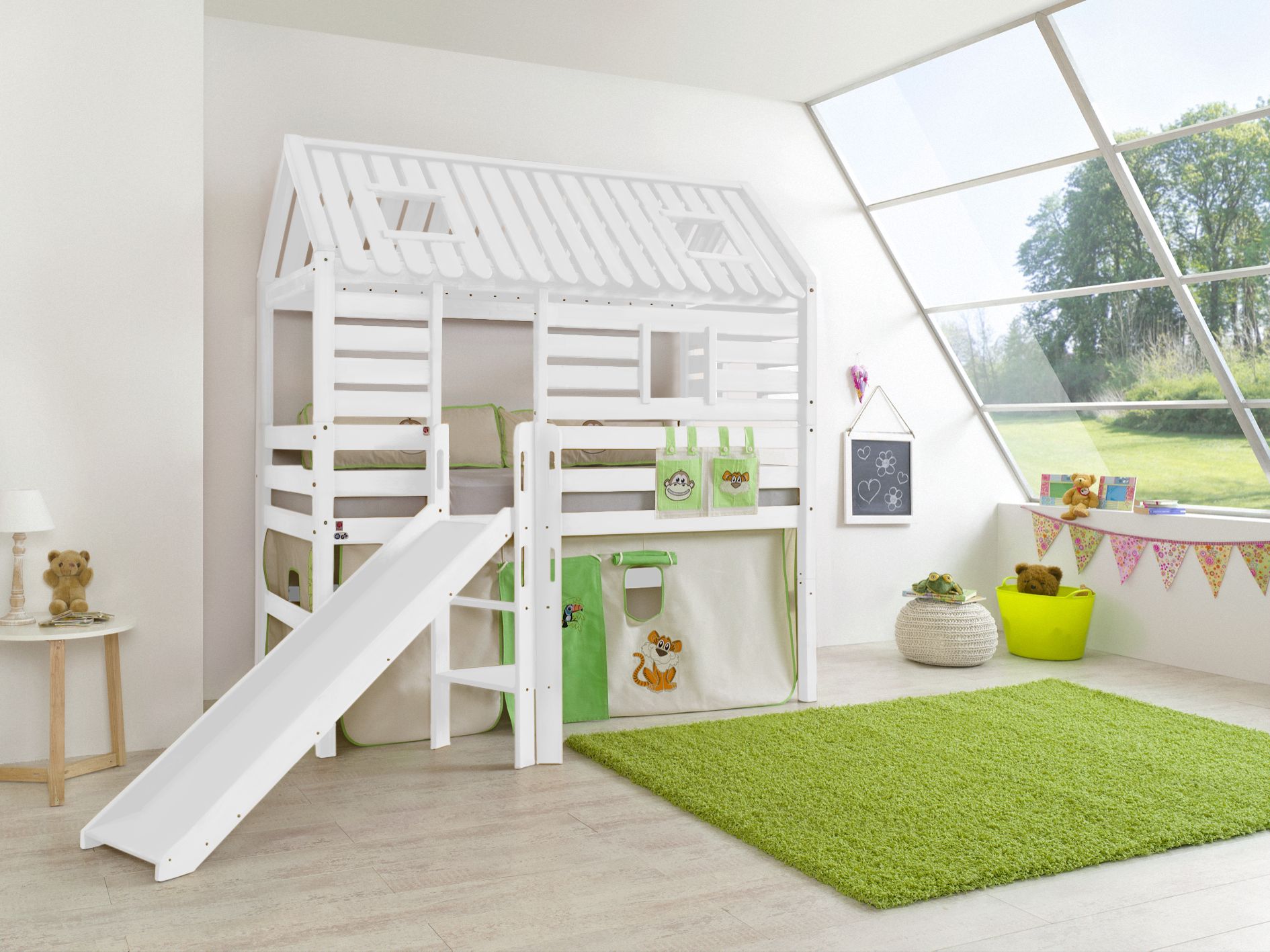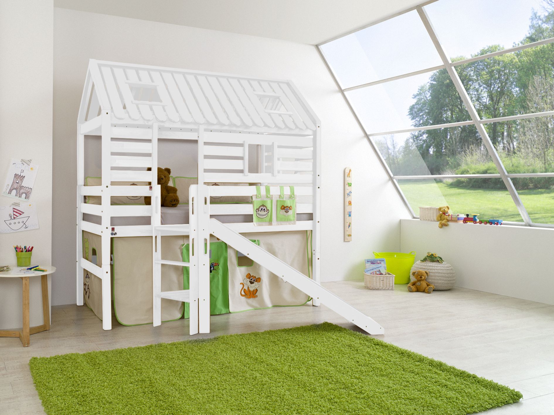 Spielbett Tom´s Hütte und Bett Eliyas mit Rutsche und Textilset Buche massiv geölt