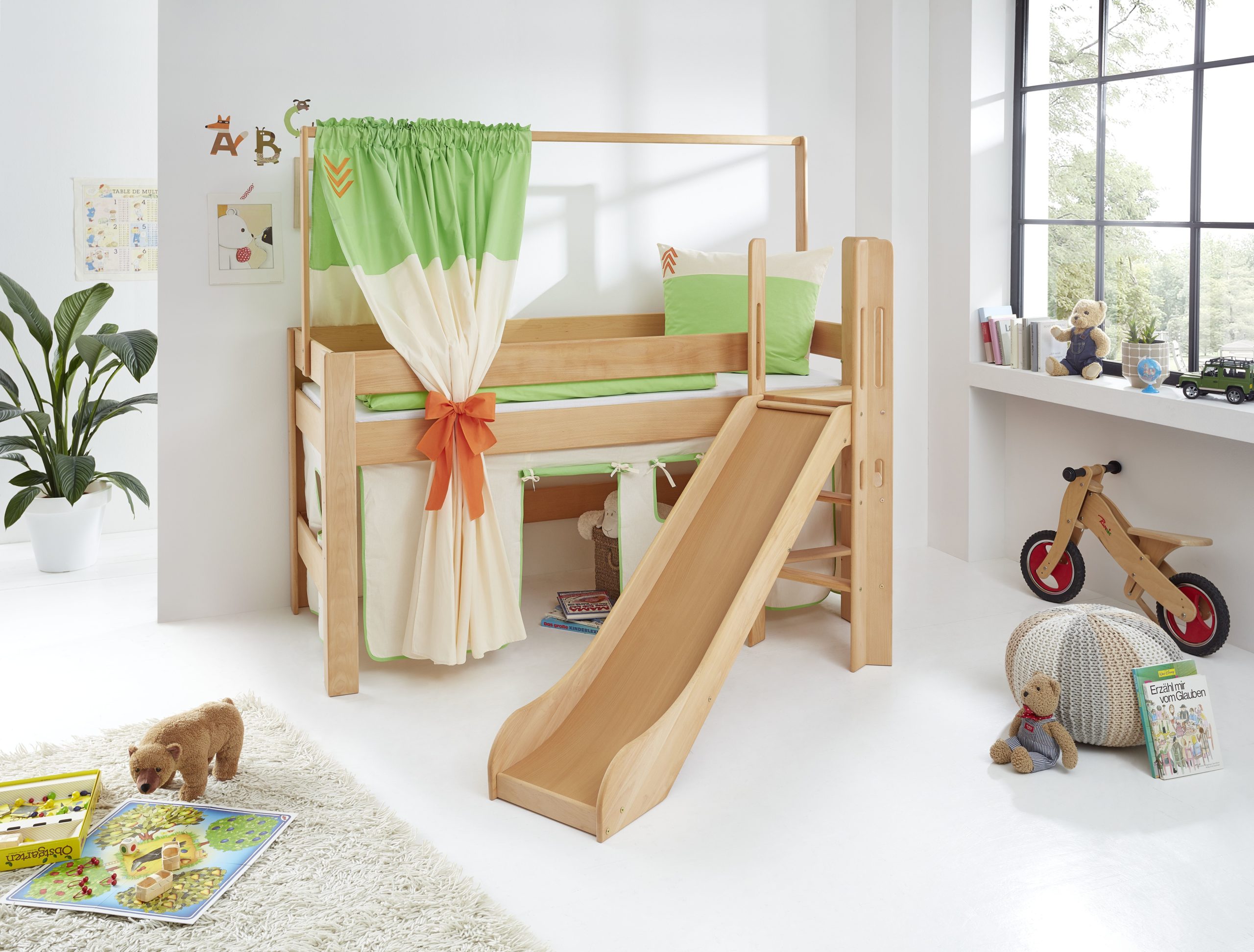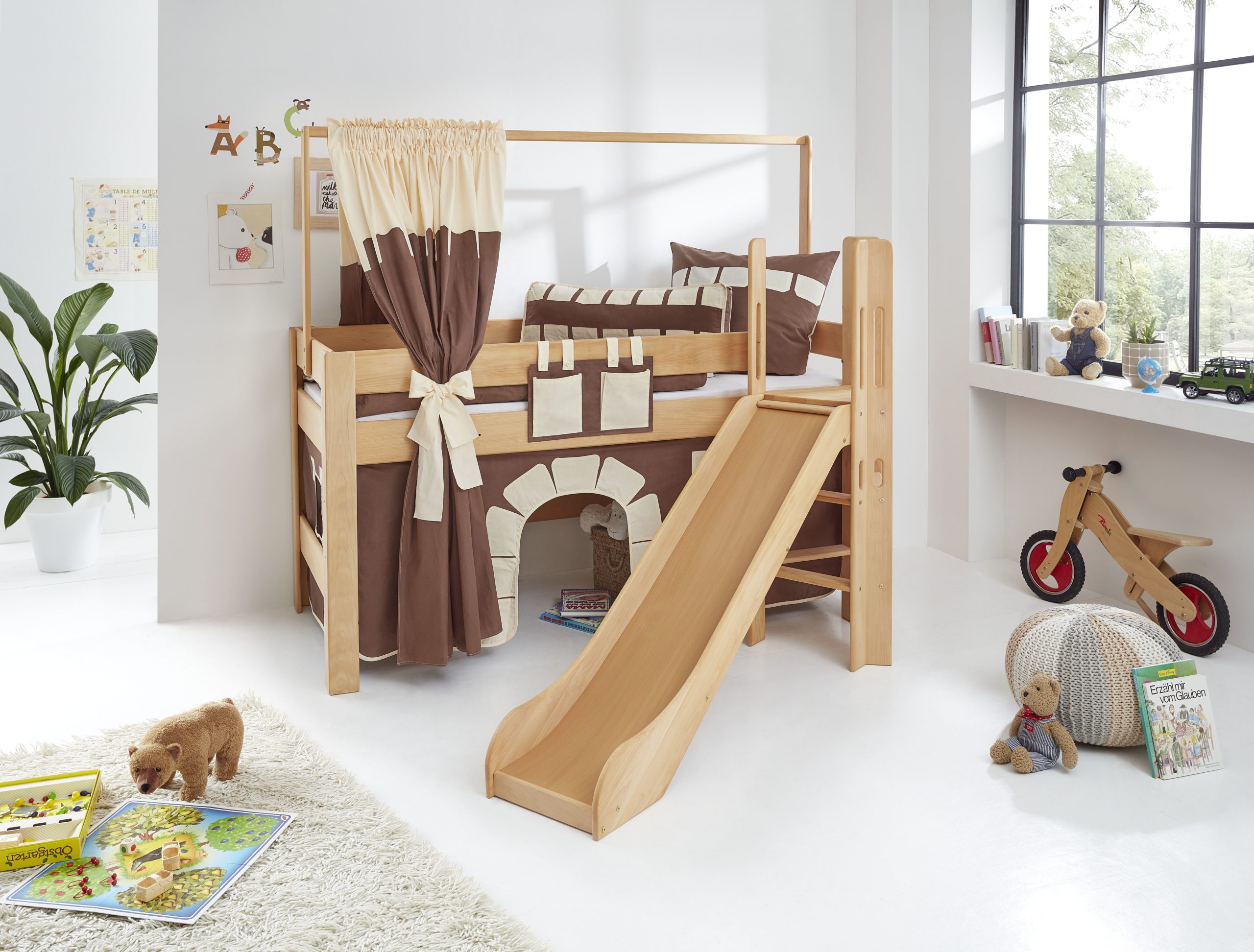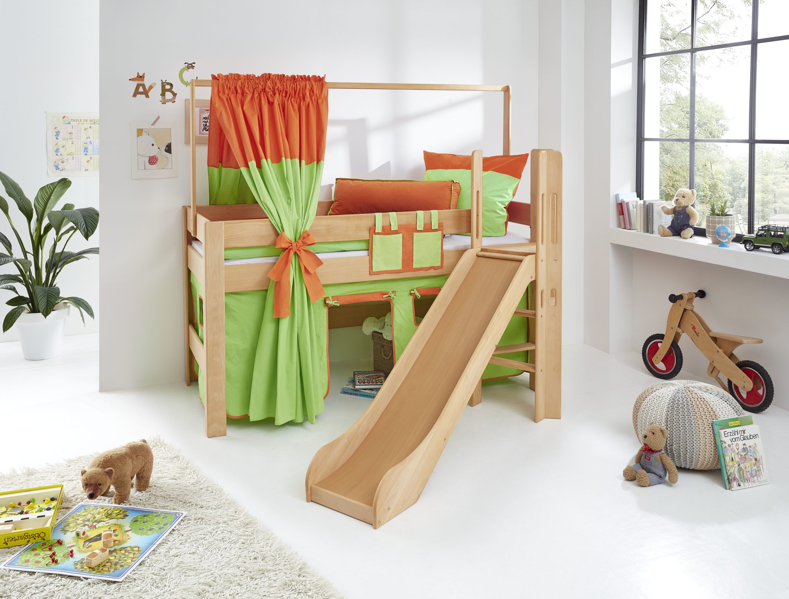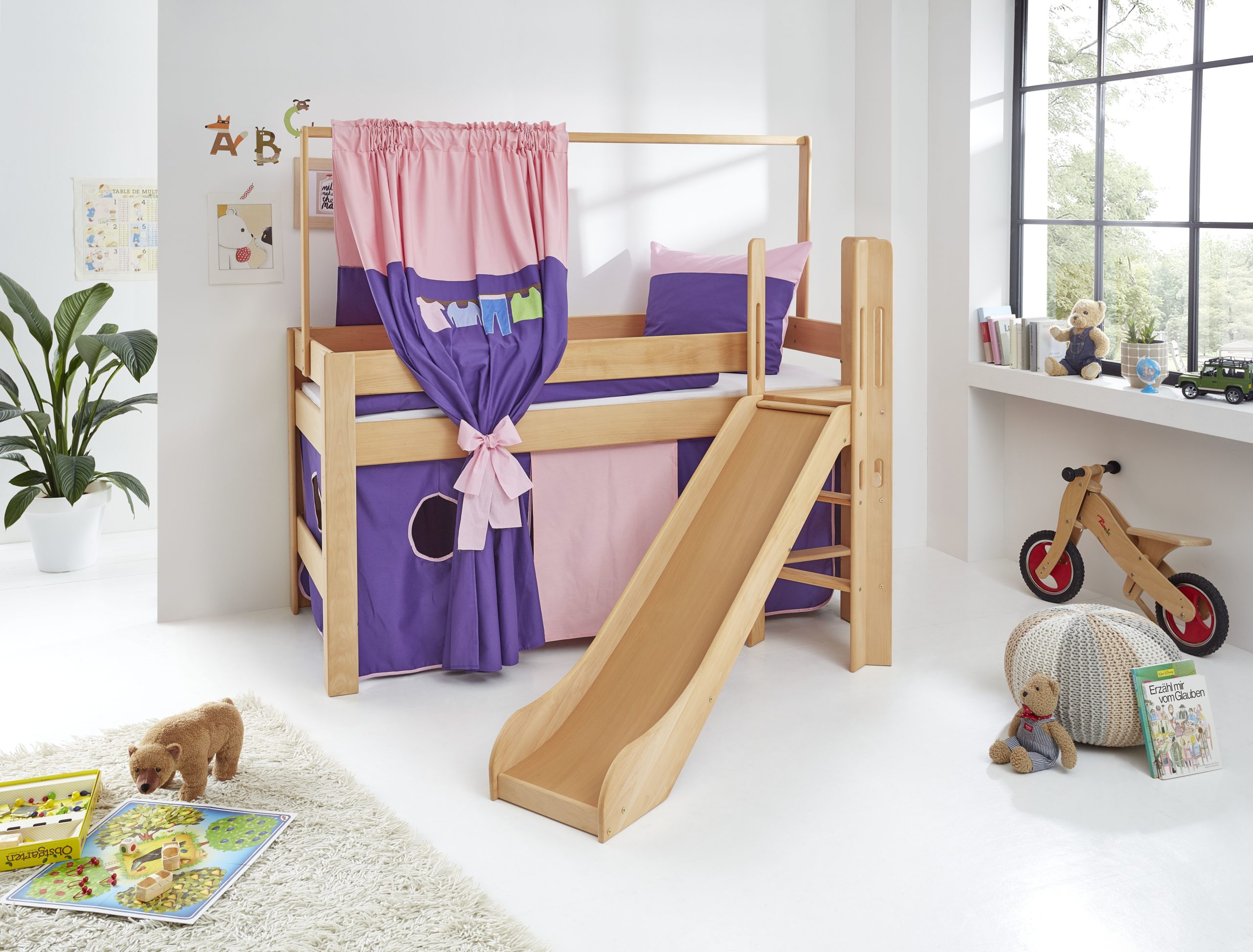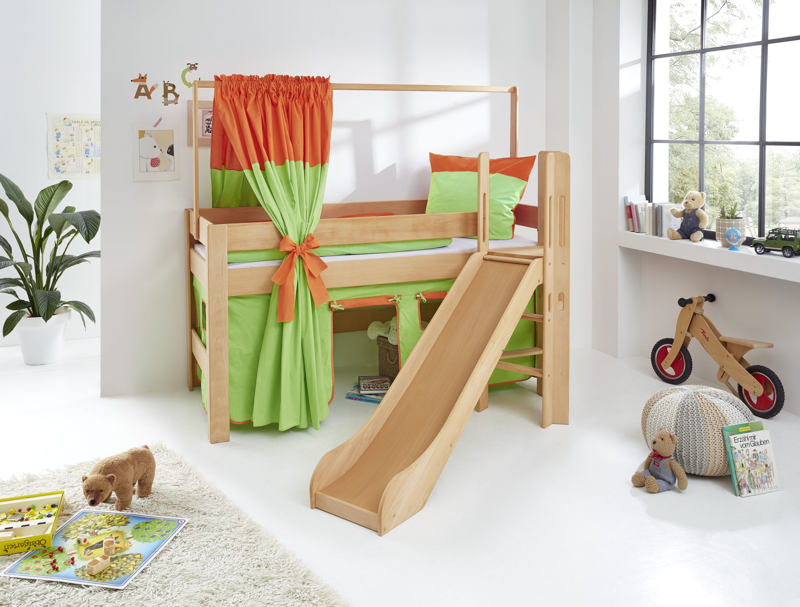 Spielbett Tom´s Hütte und Bett Eliyas mit Rutsche und Textilset Buche massiv geölt