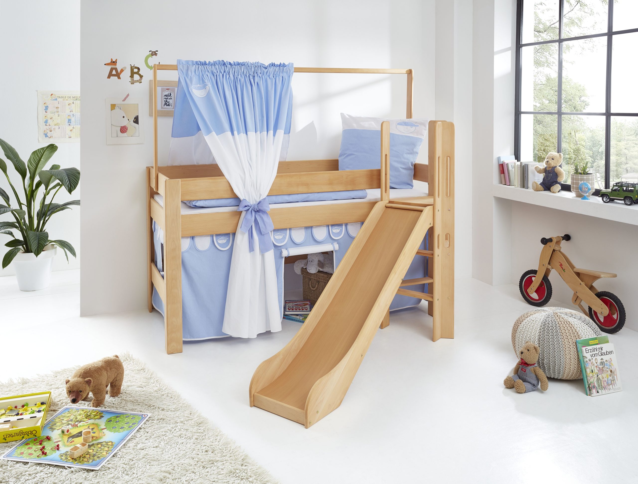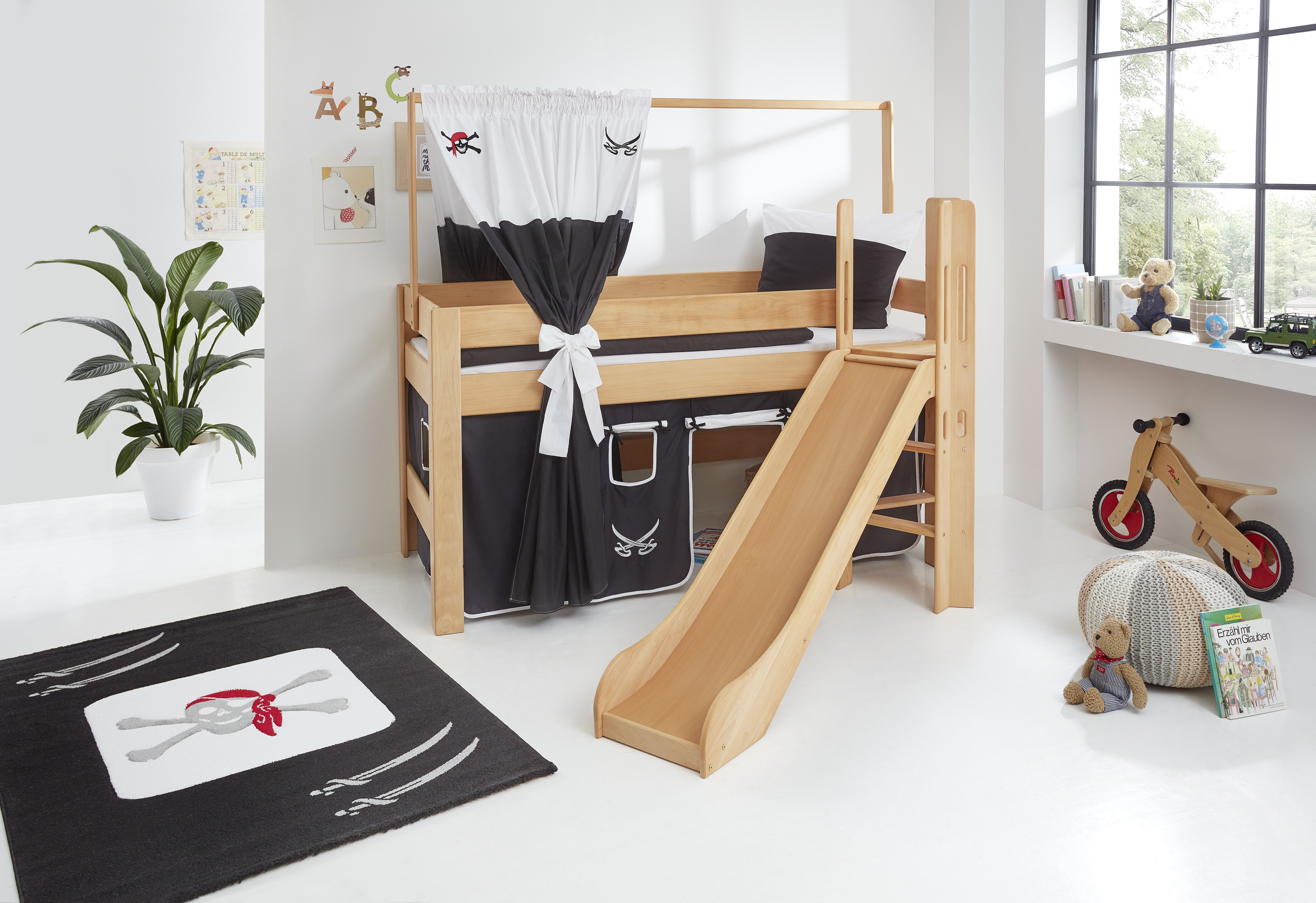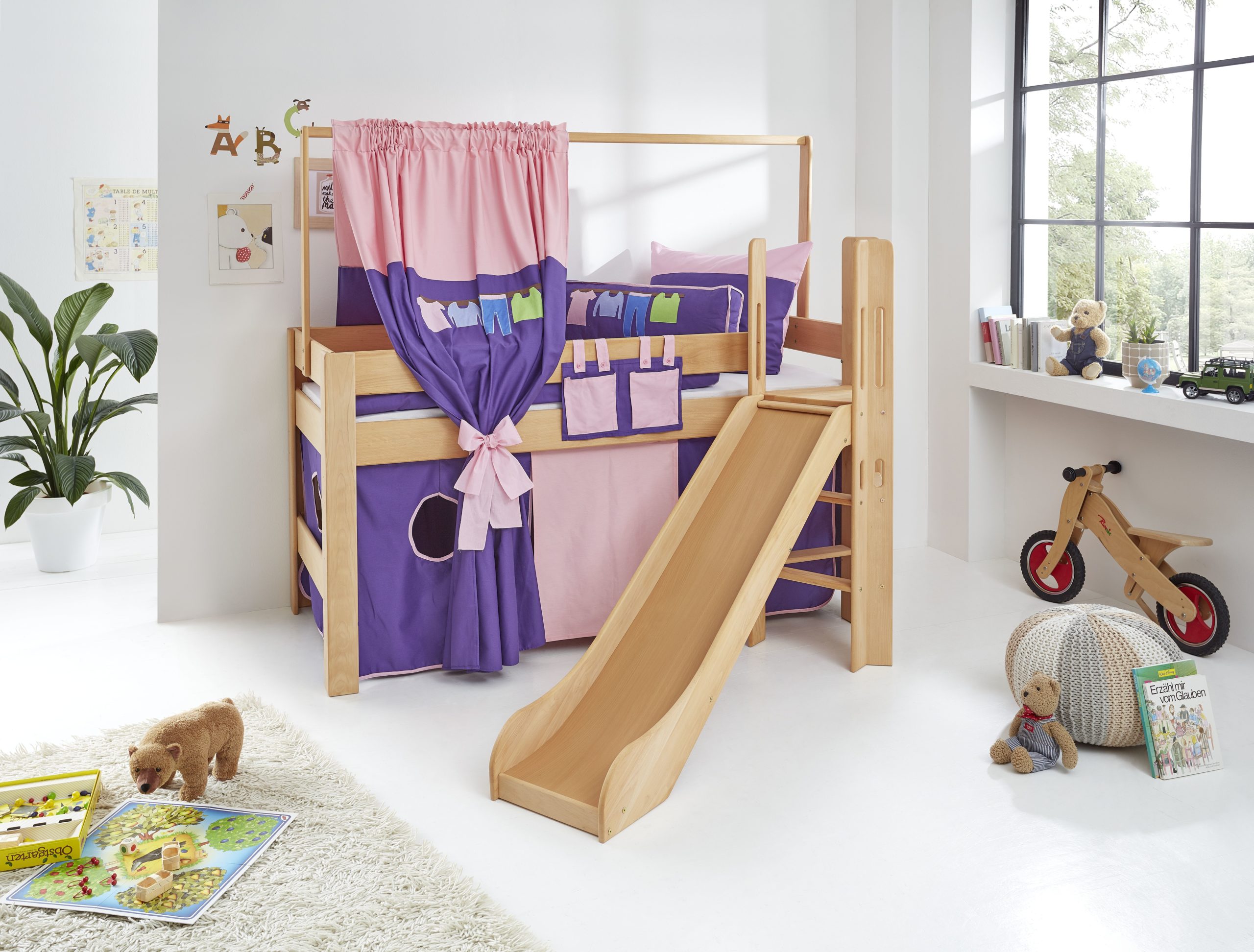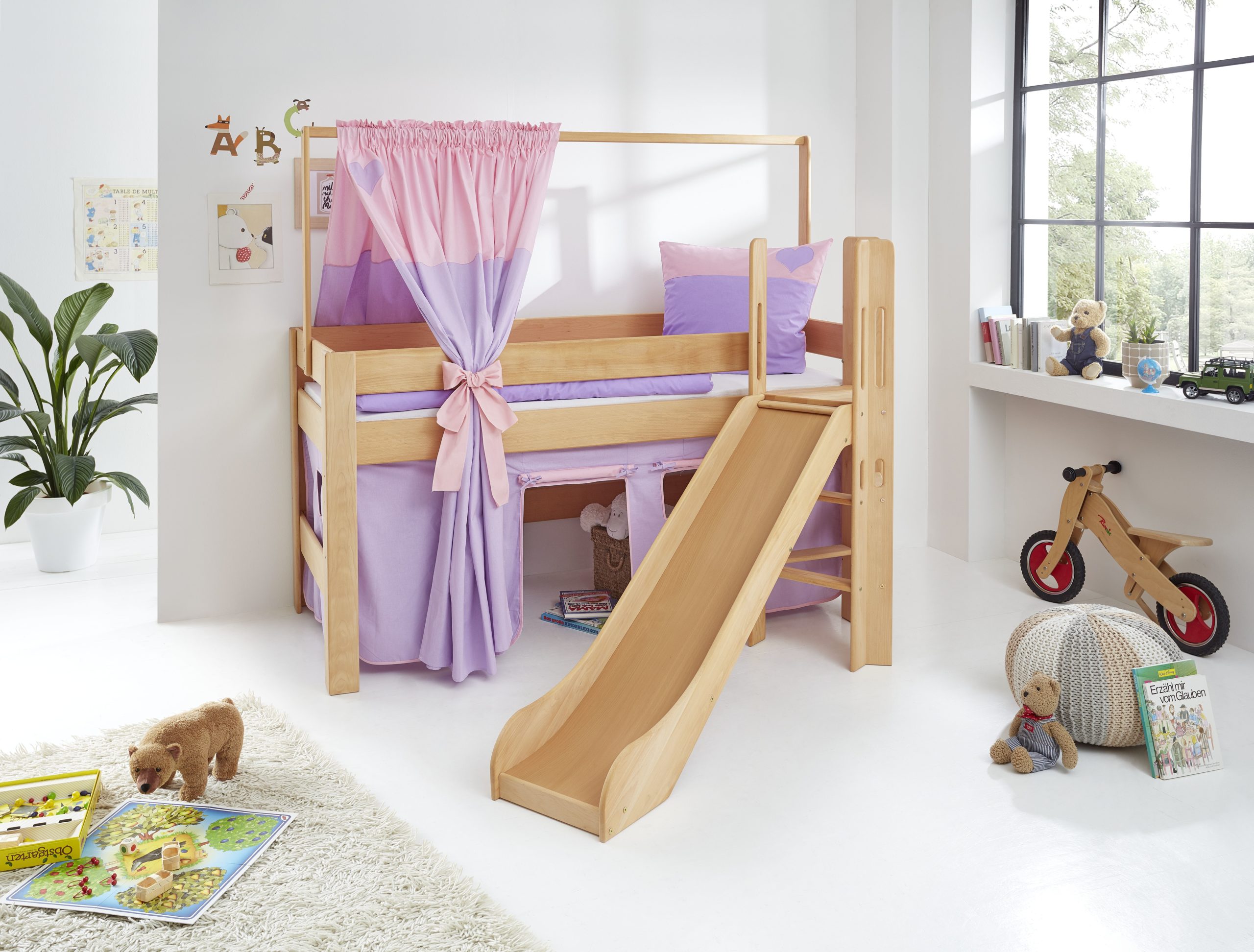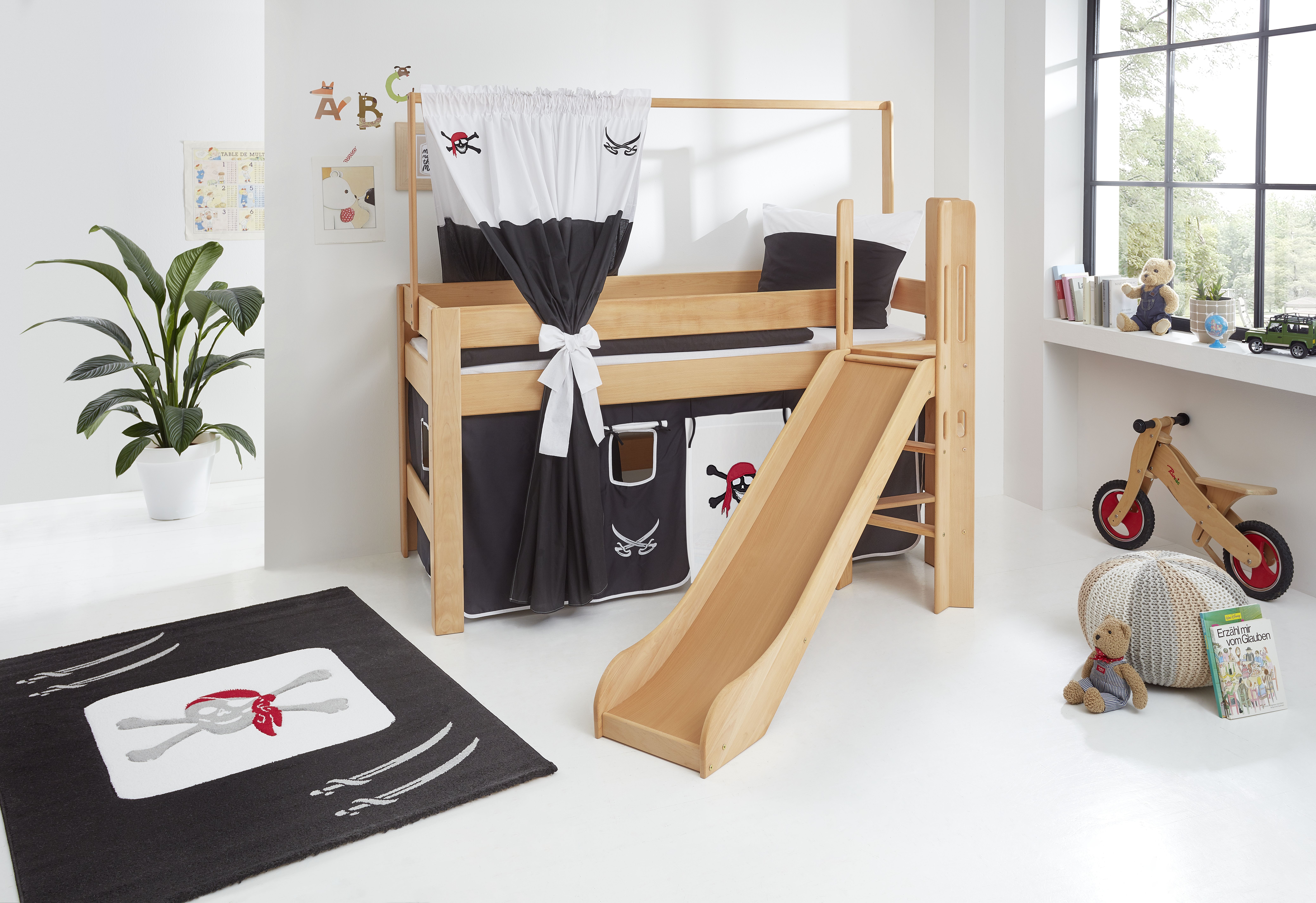 Spielbett Tom´s Hütte und Bett Eliyas mit Rutsche und Textilset Buche massiv geölt