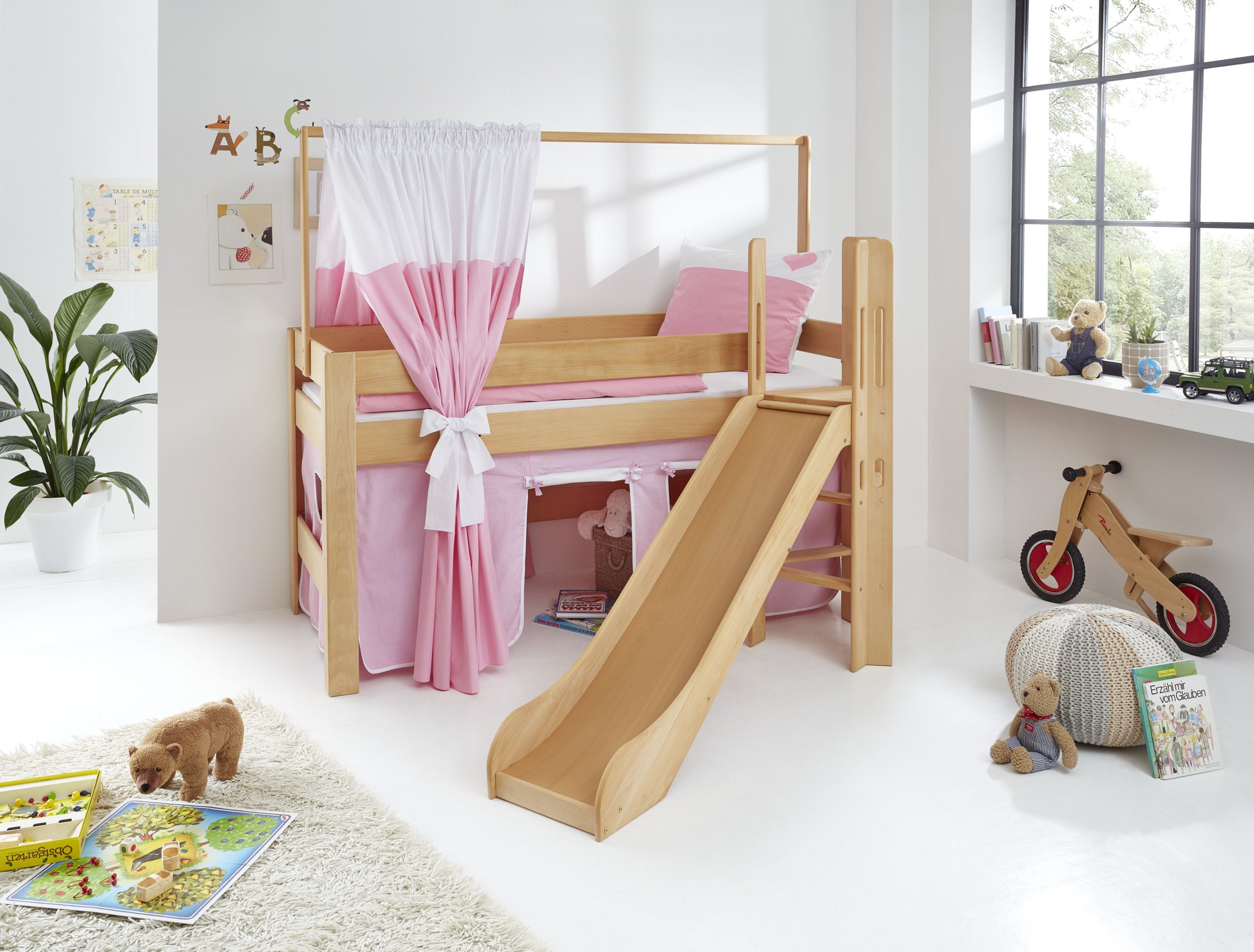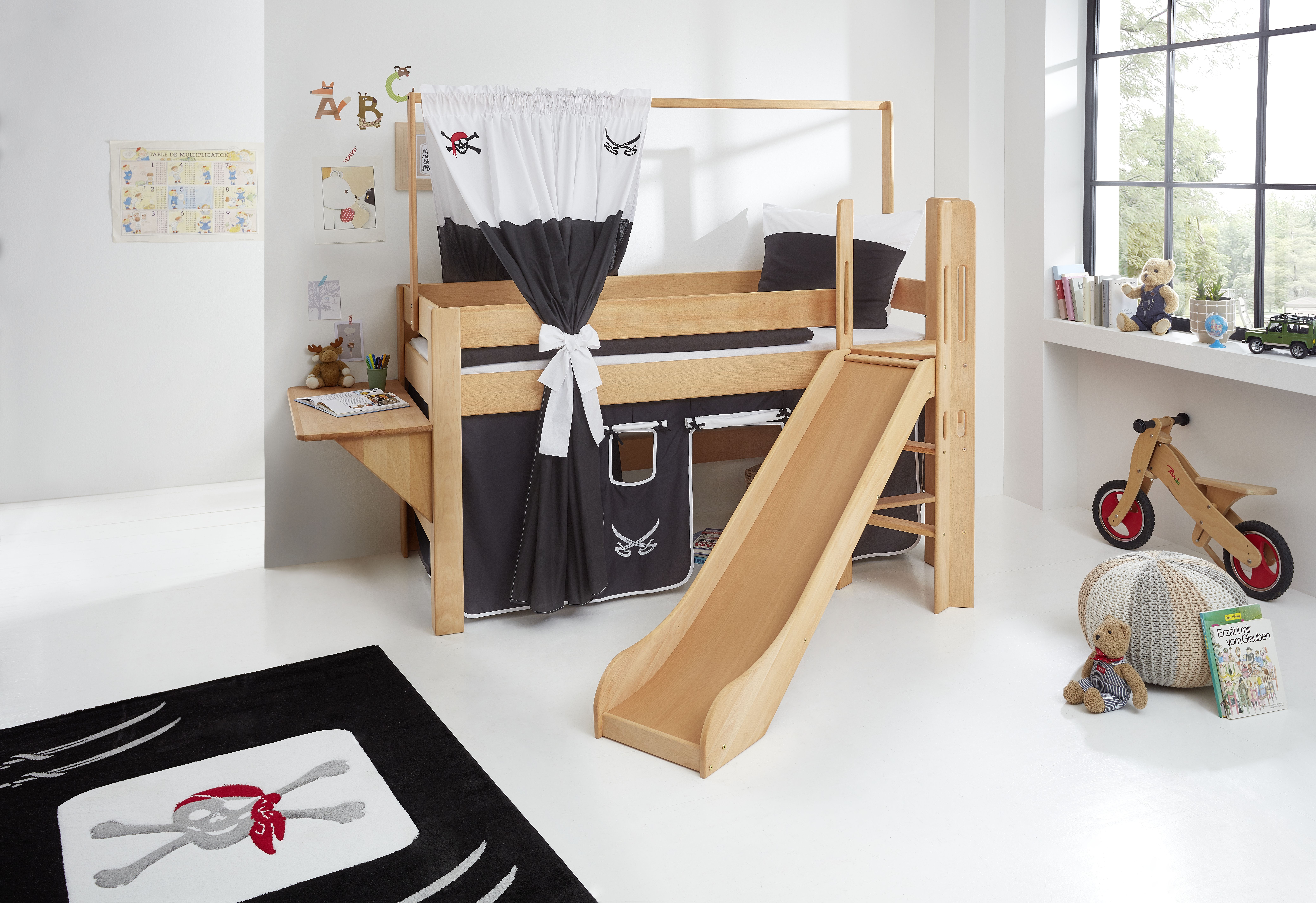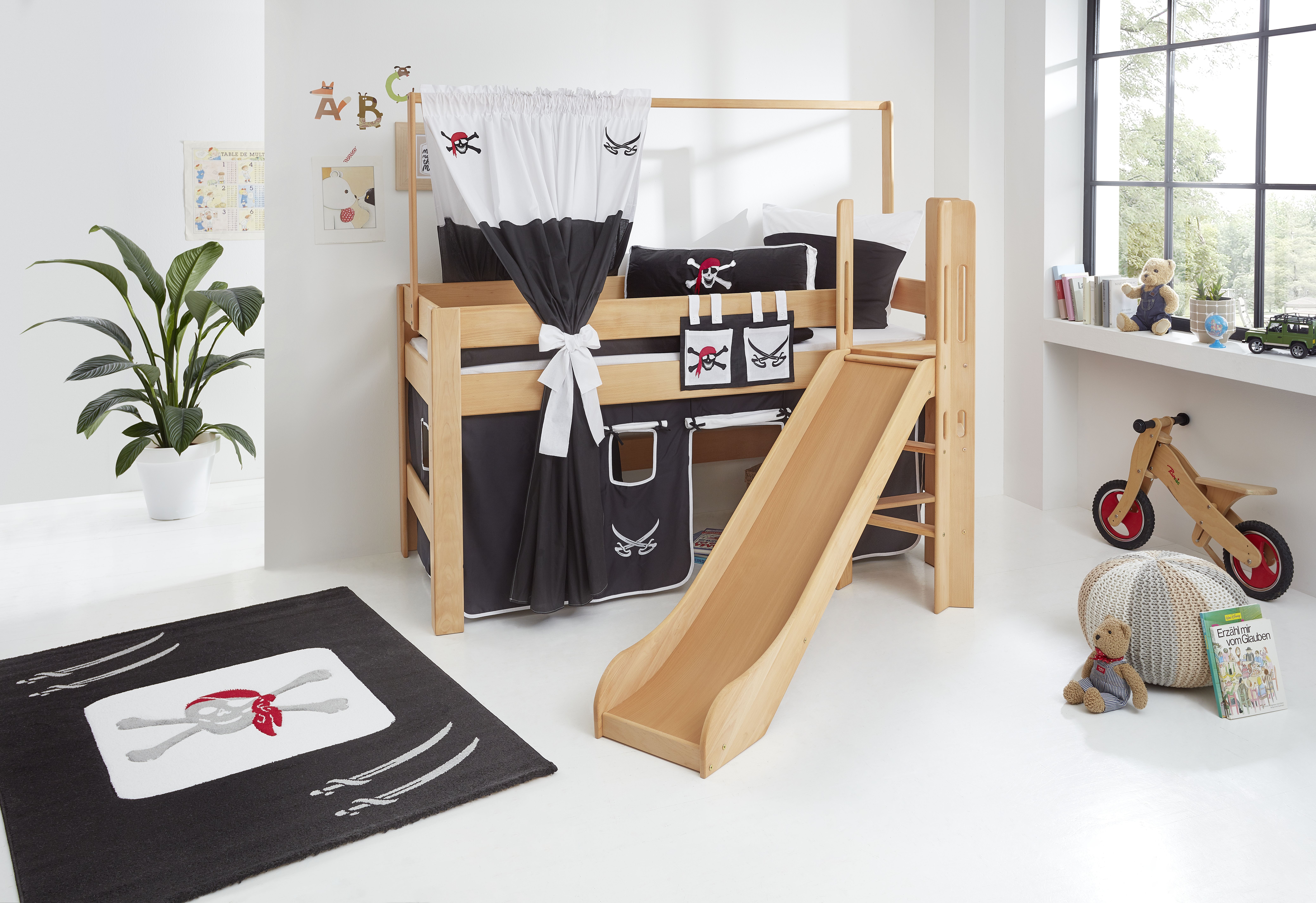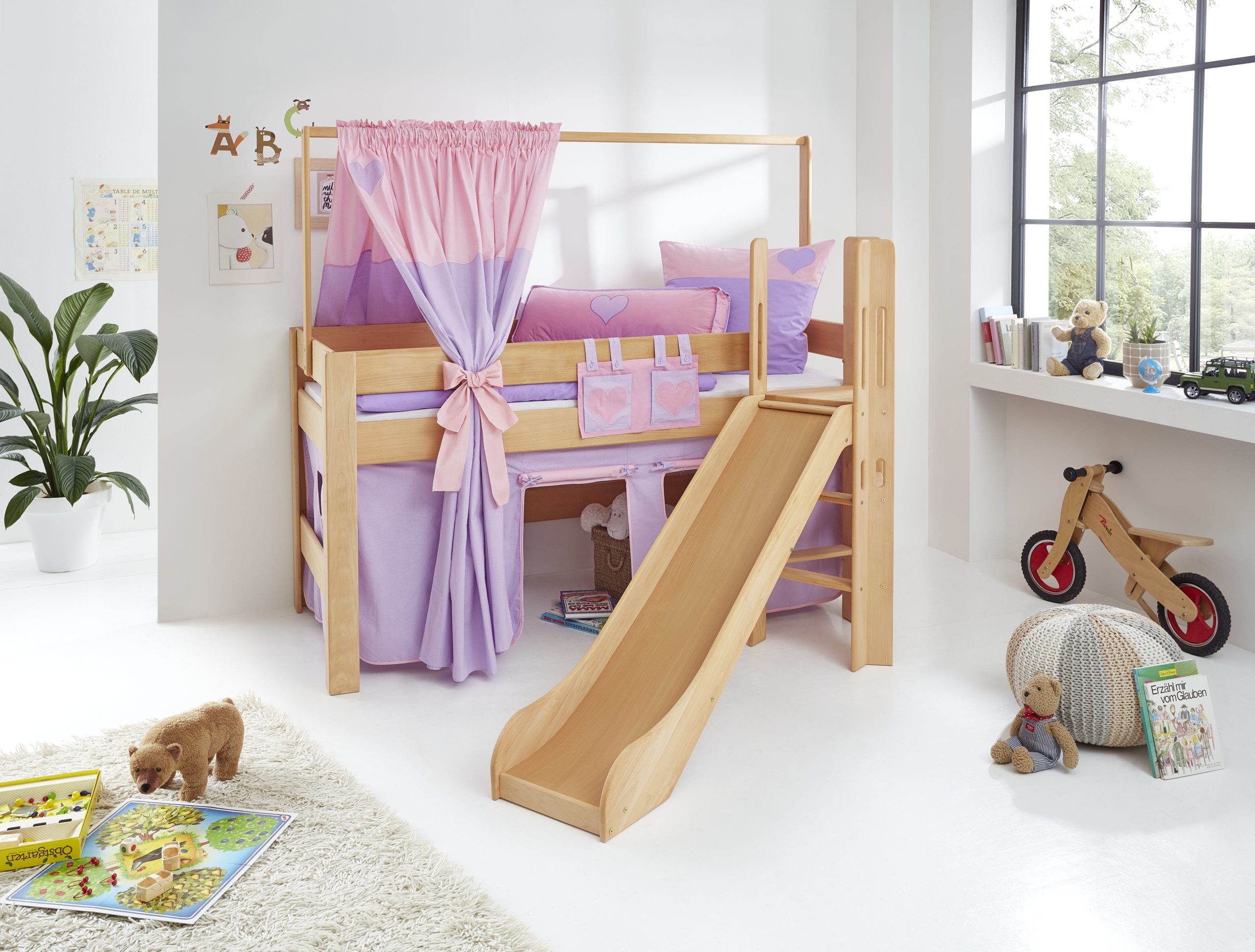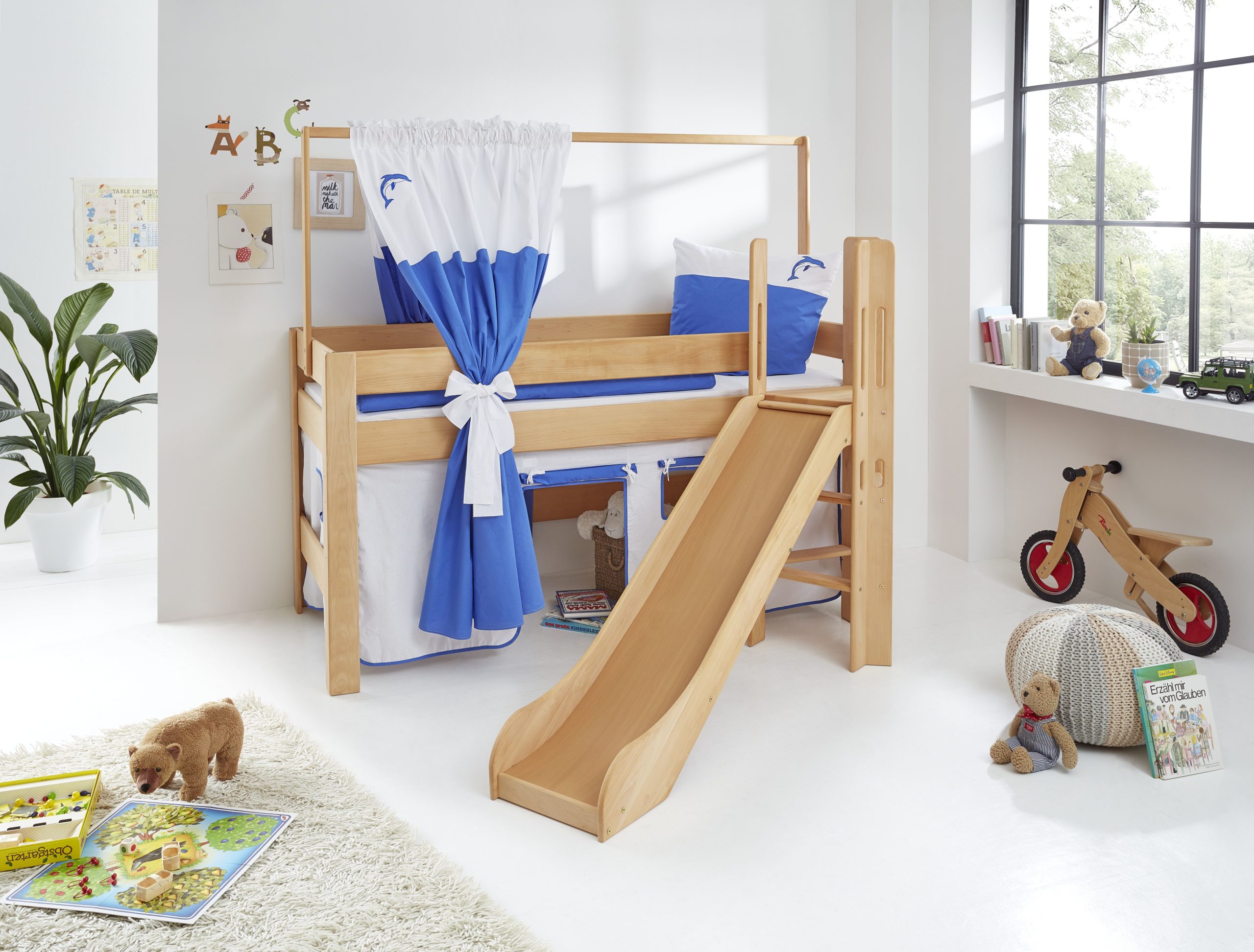 Spielbett Tom´s Hütte und Bett Eliyas mit Rutsche und Textilset Buche massiv geölt