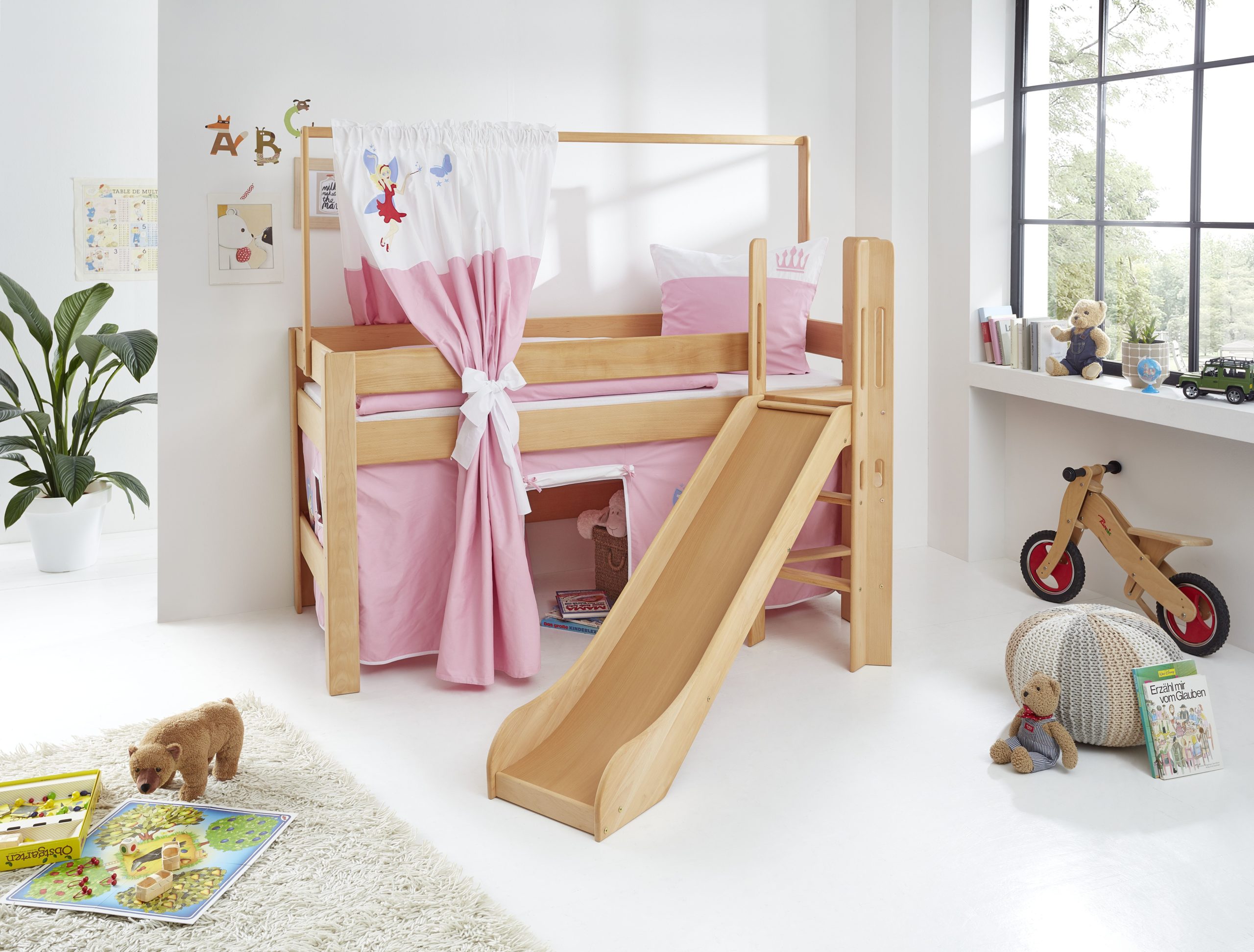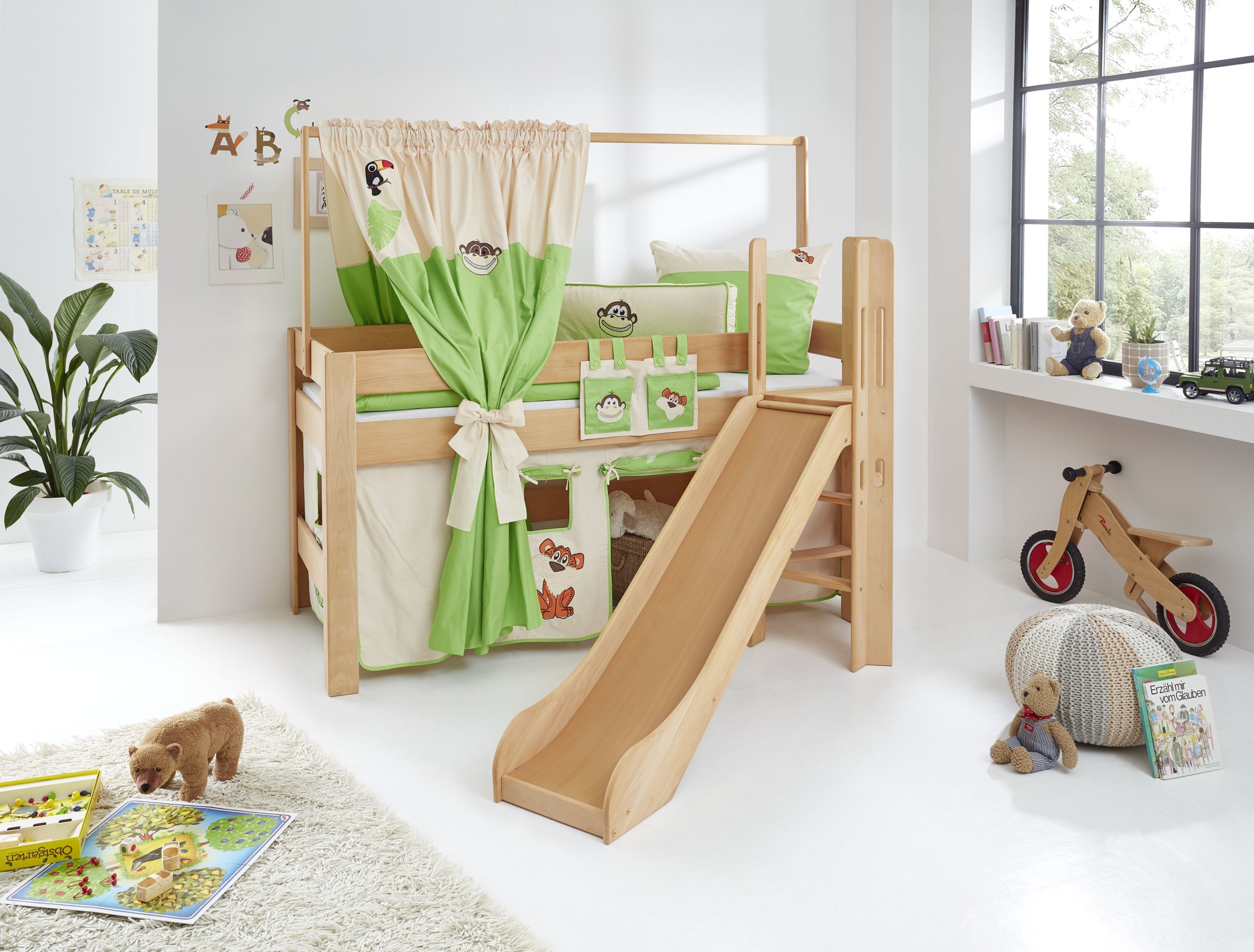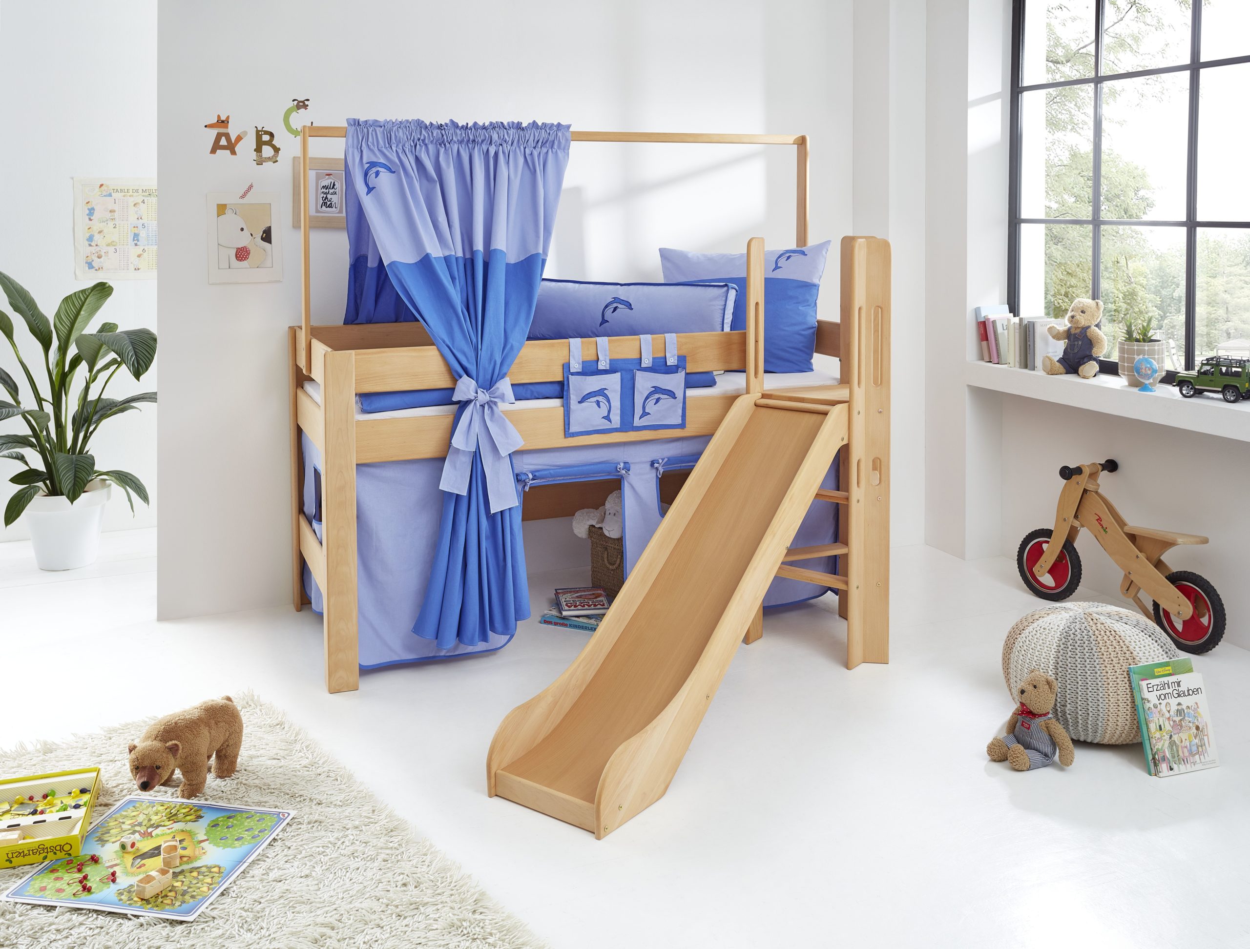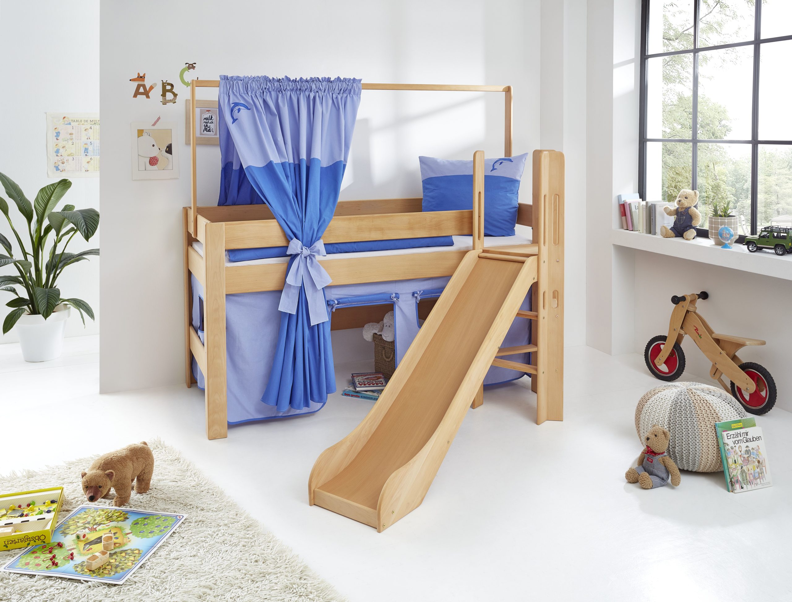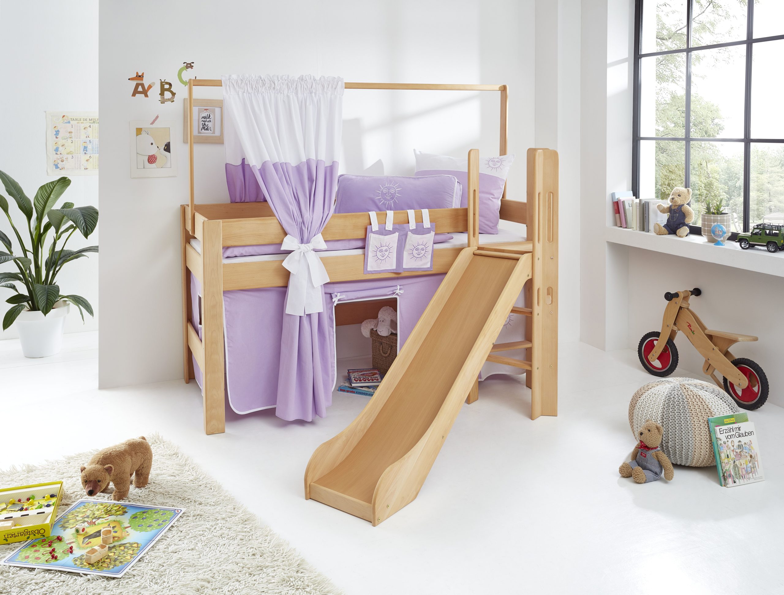 Spielbett Tom´s Hütte und Bett Eliyas mit Rutsche und Textilset Buche massiv geölt