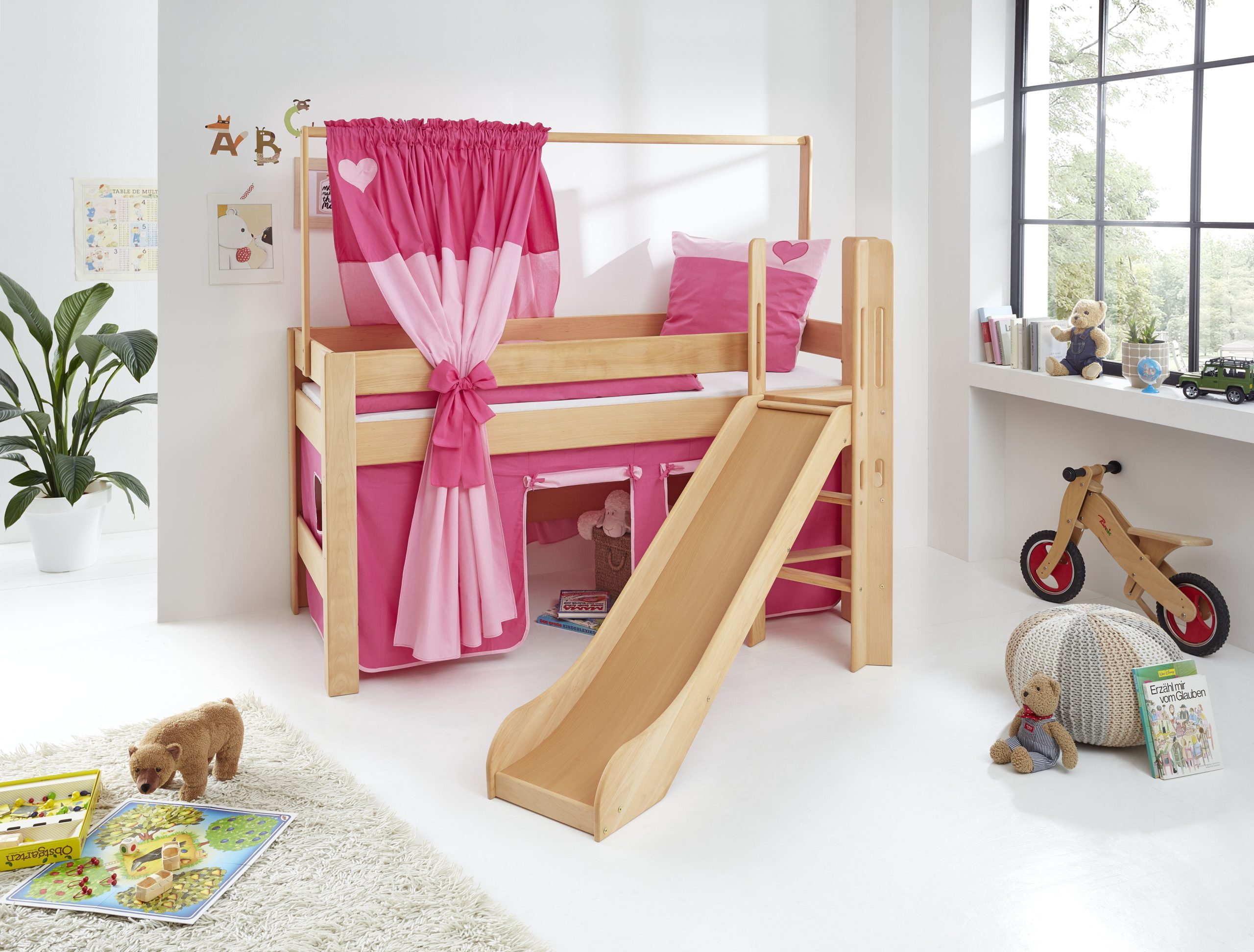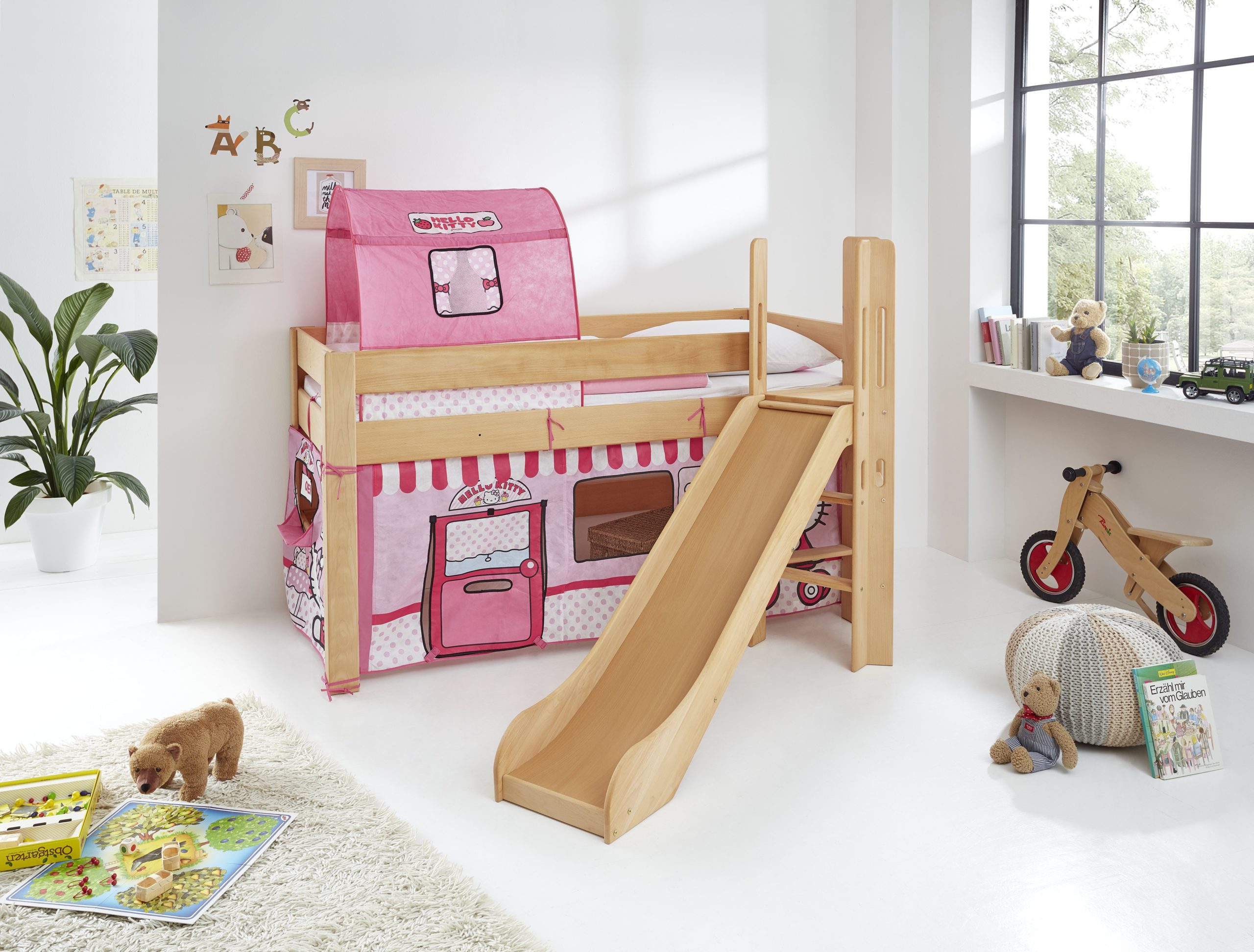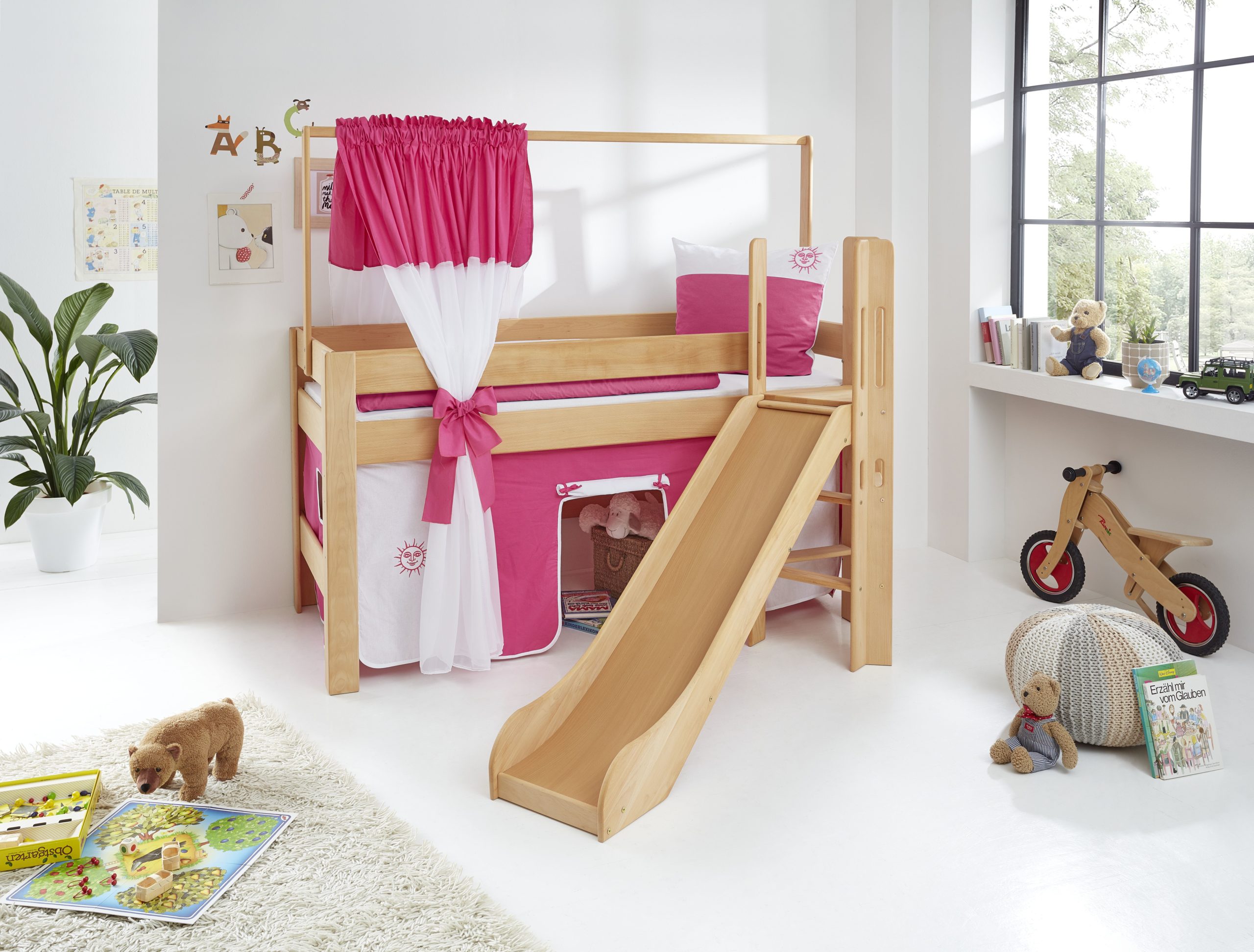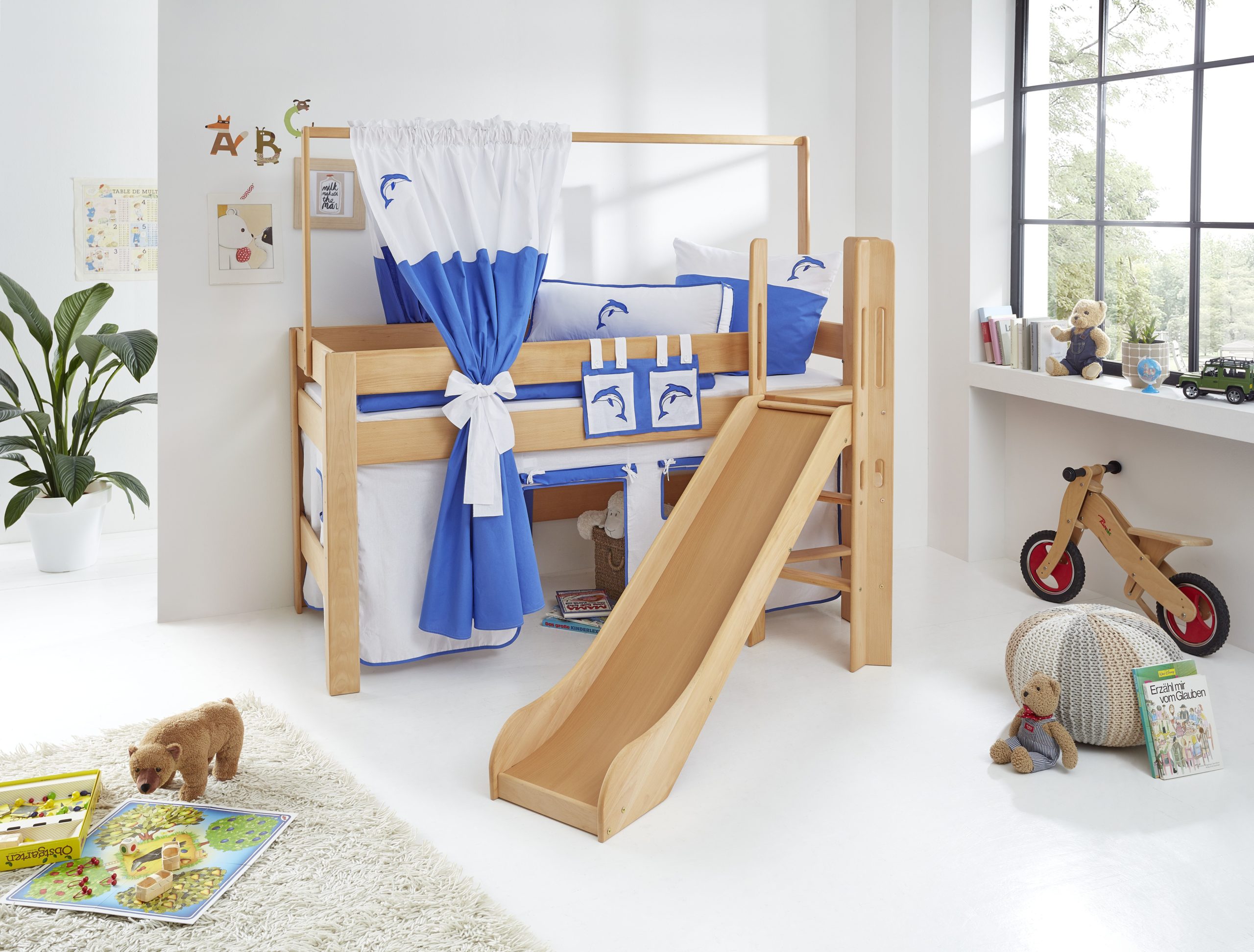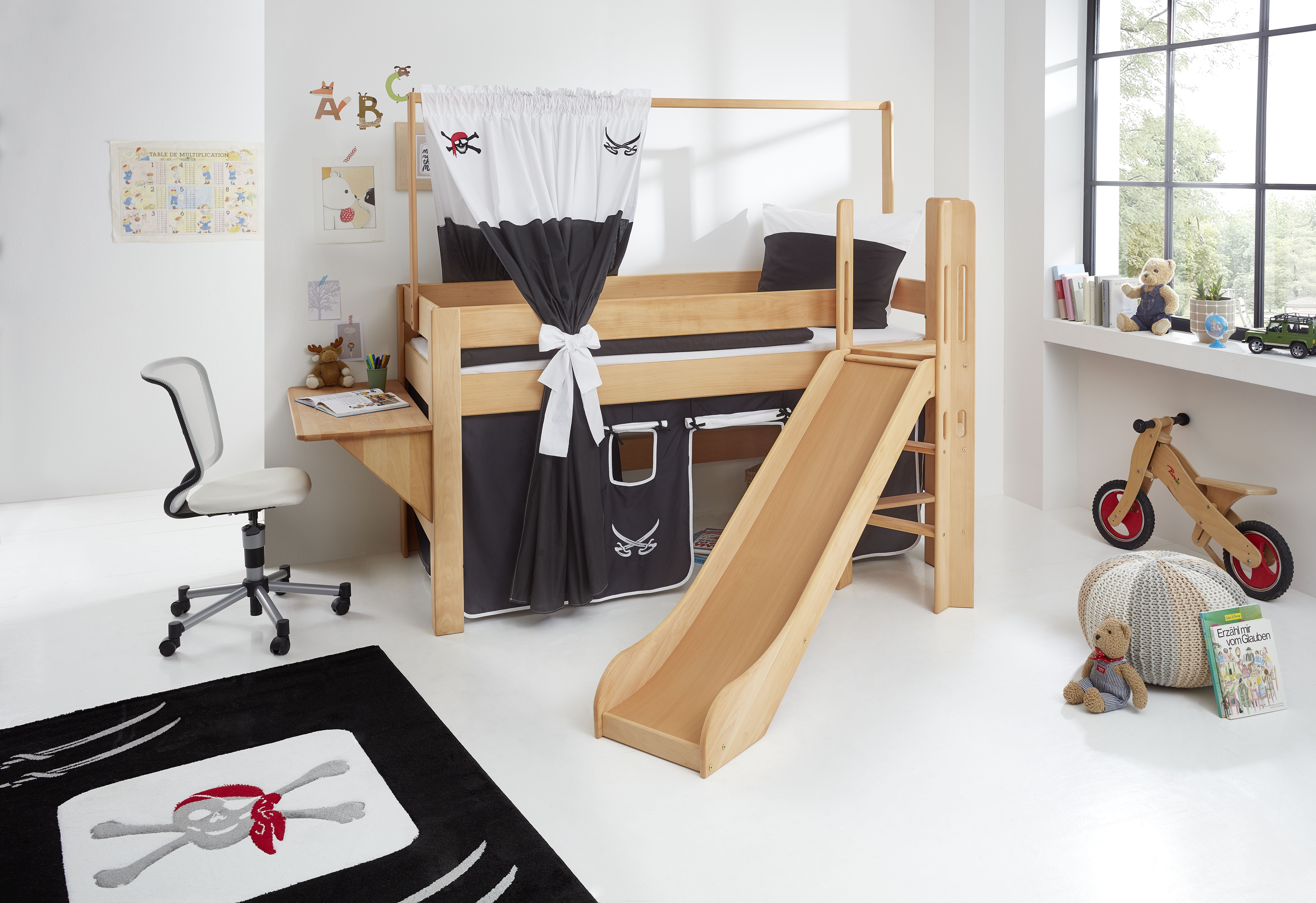 Spielbett Tom´s Hütte und Bett Eliyas mit Rutsche und Textilset Buche massiv geölt