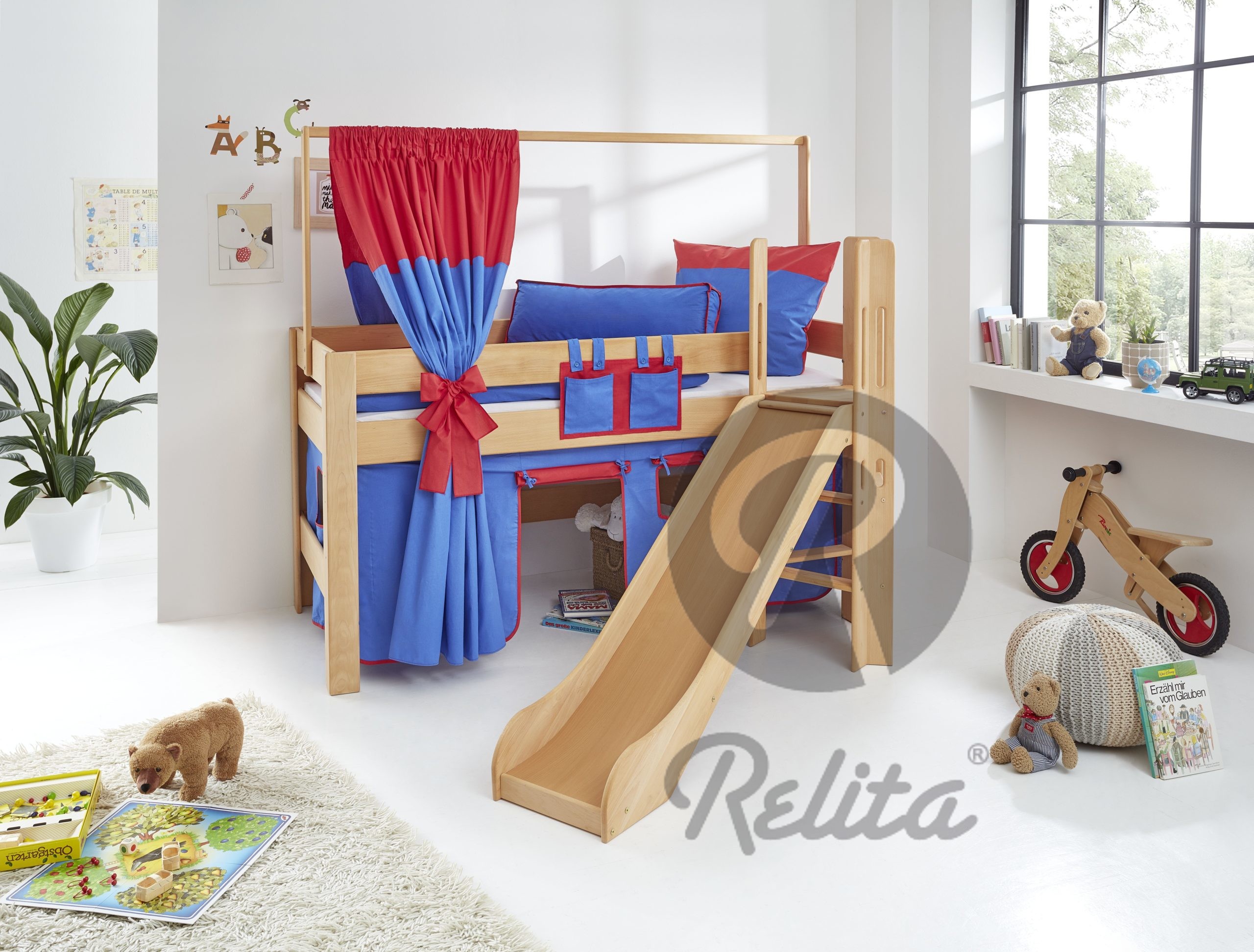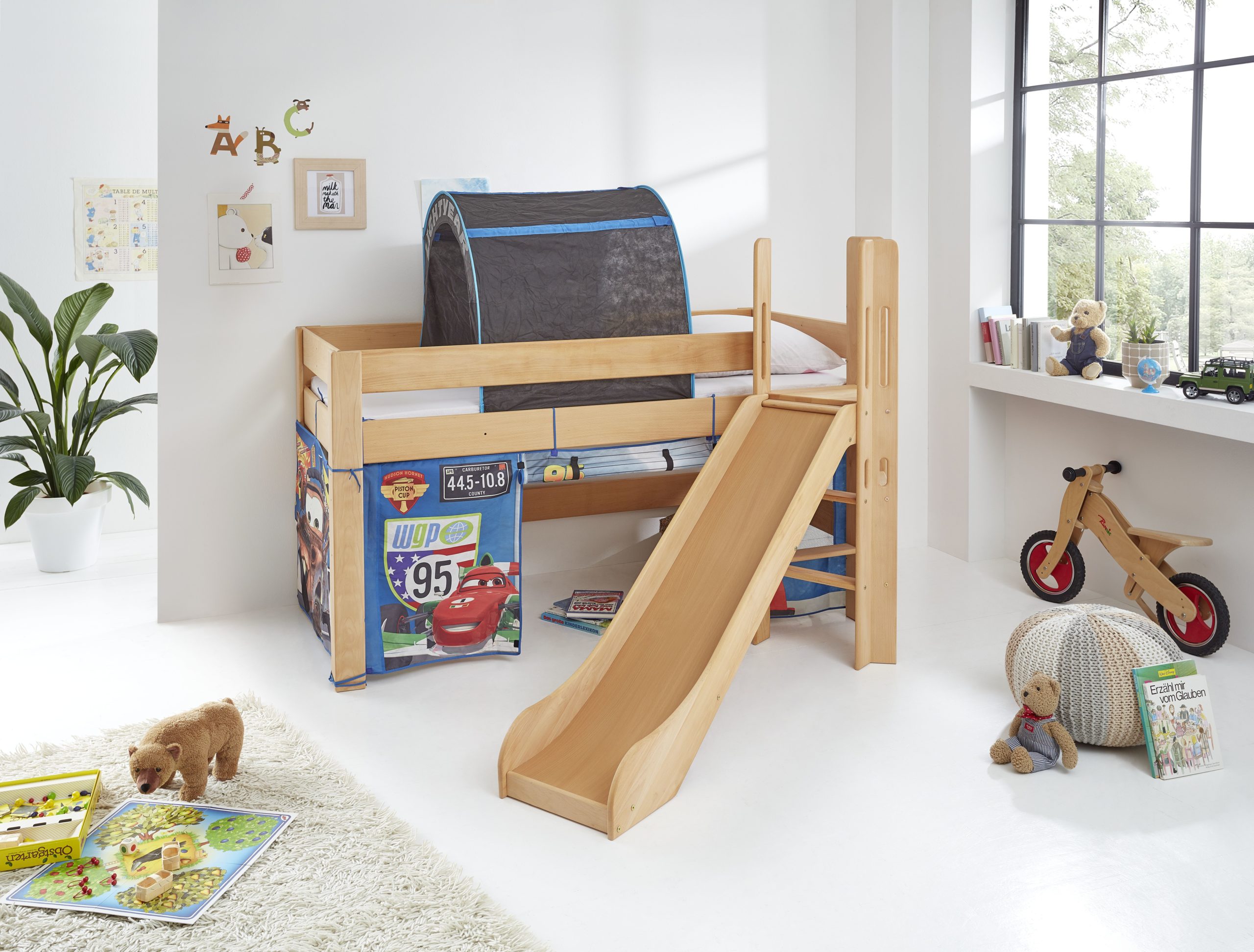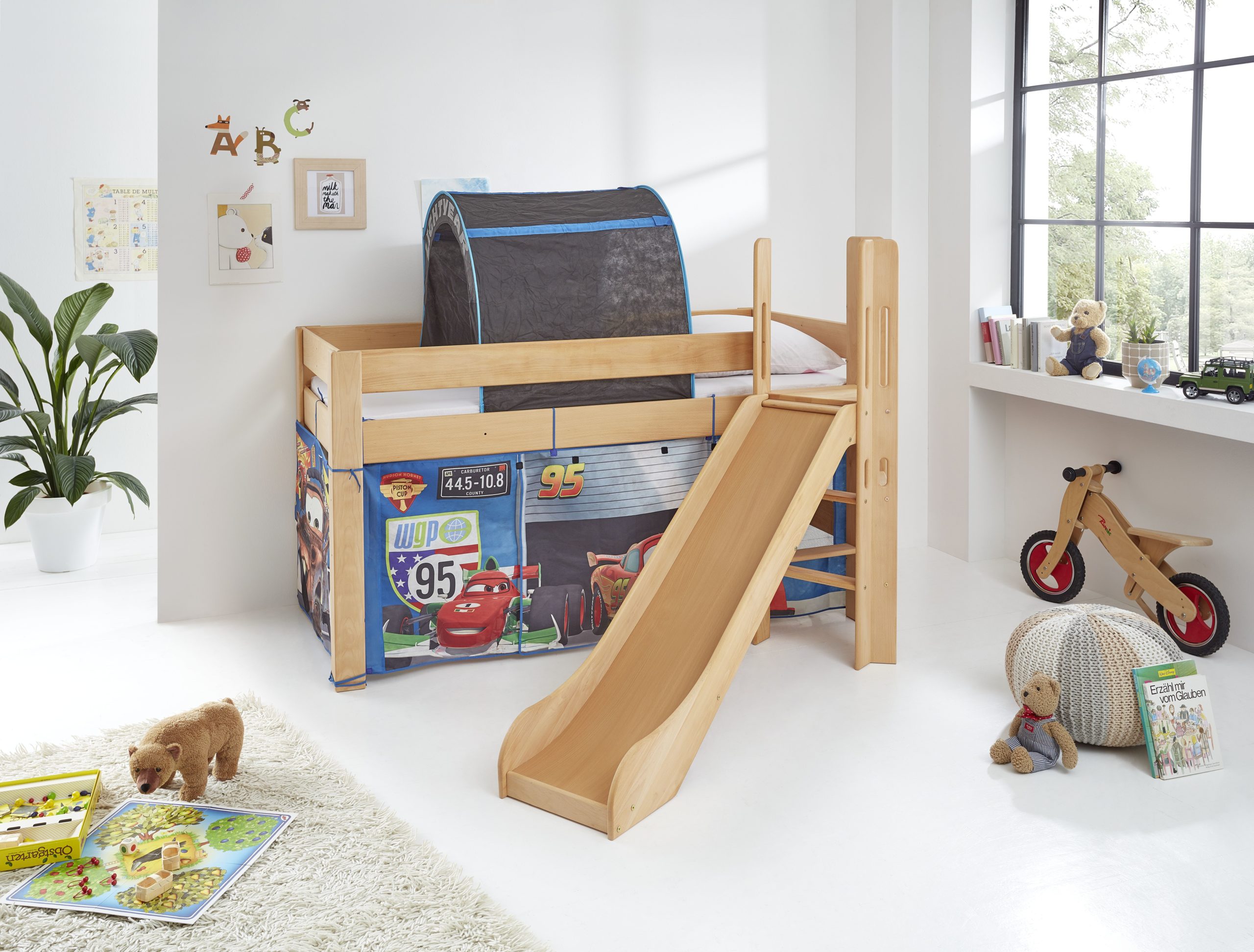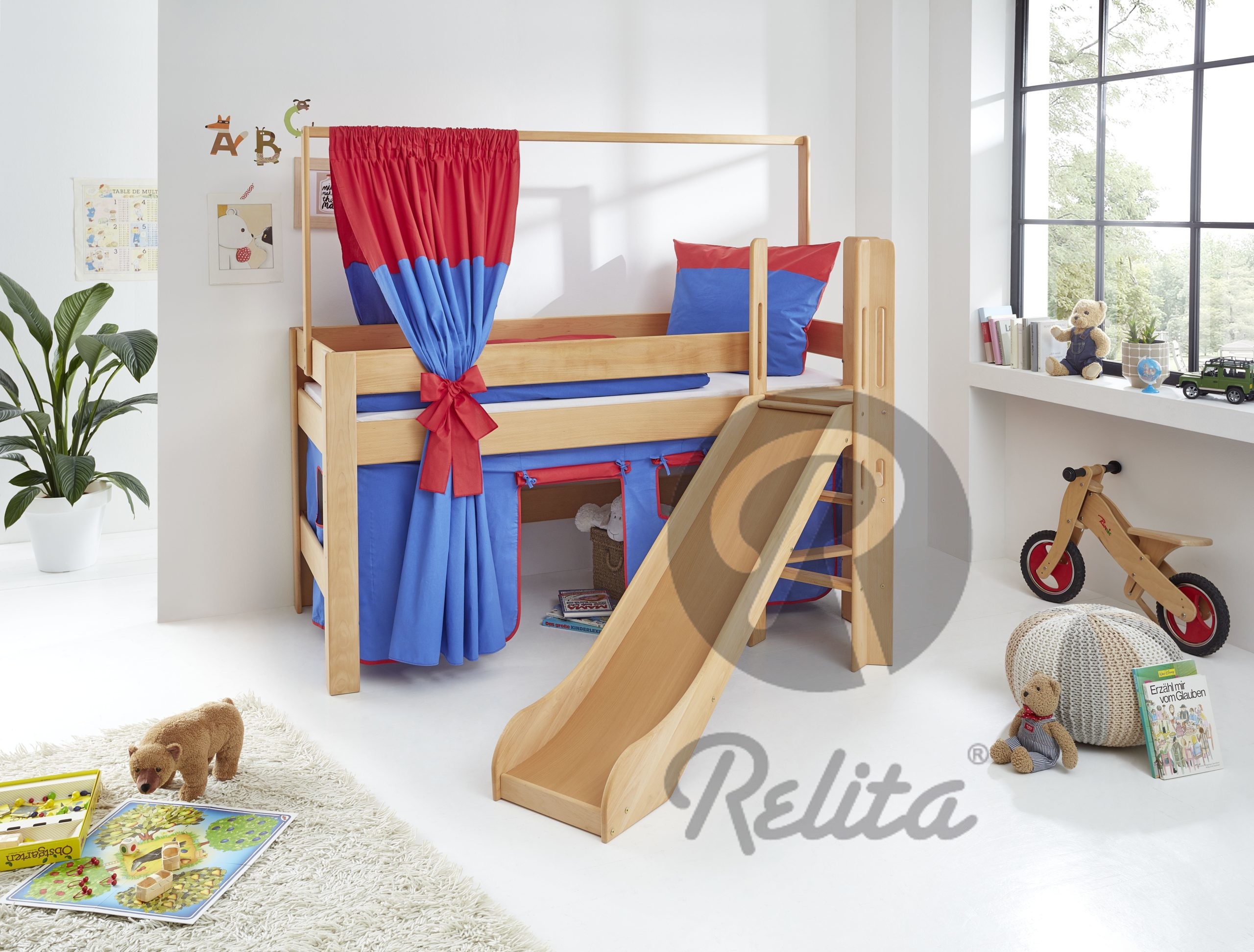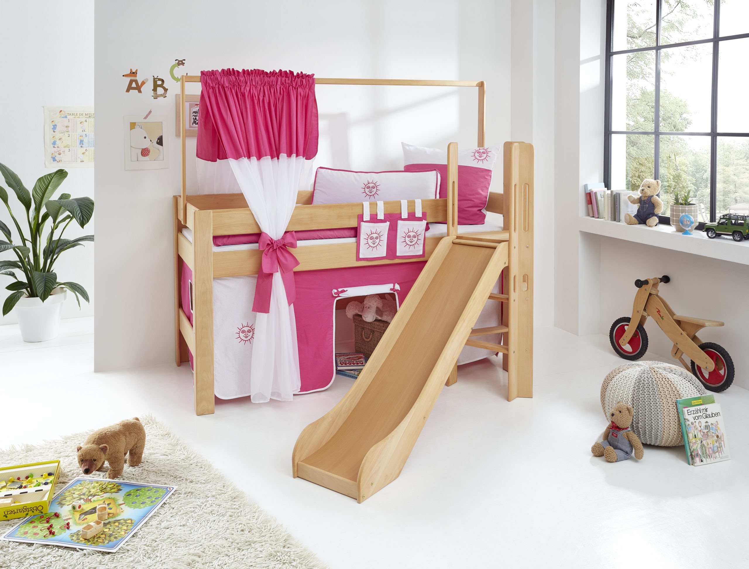 Spielbett Tom´s Hütte und Bett Eliyas mit Rutsche und Textilset Buche massiv geölt