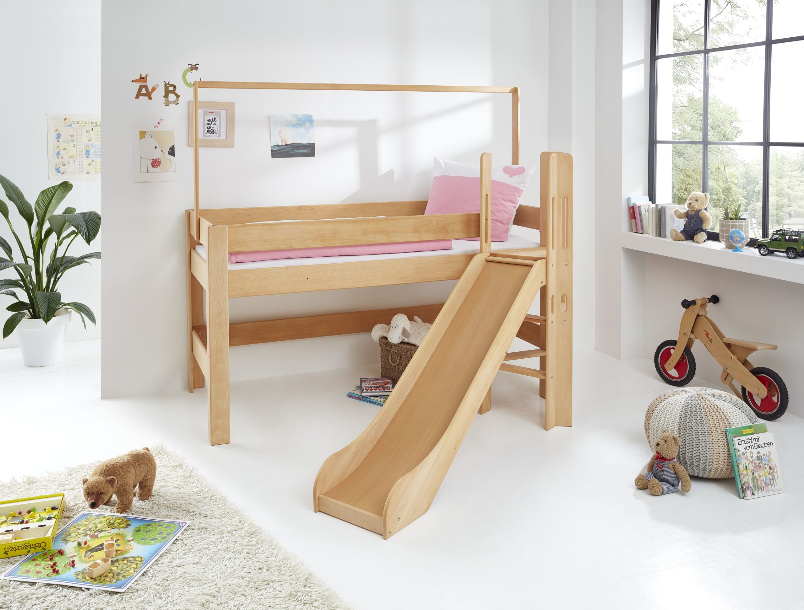 Spielbett LEO Buche massiv geölt mit Rutsche und über Eck gebauter Leiter